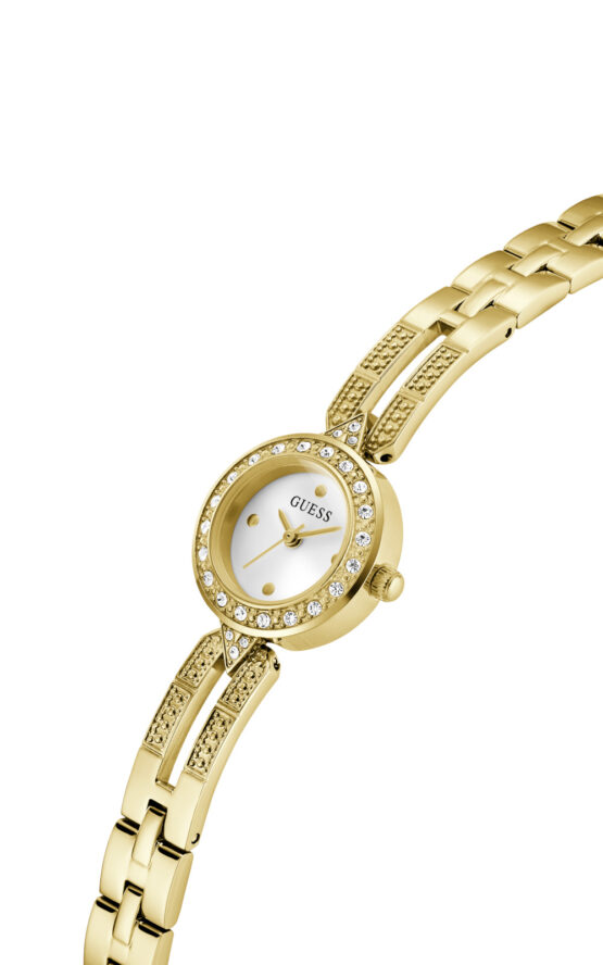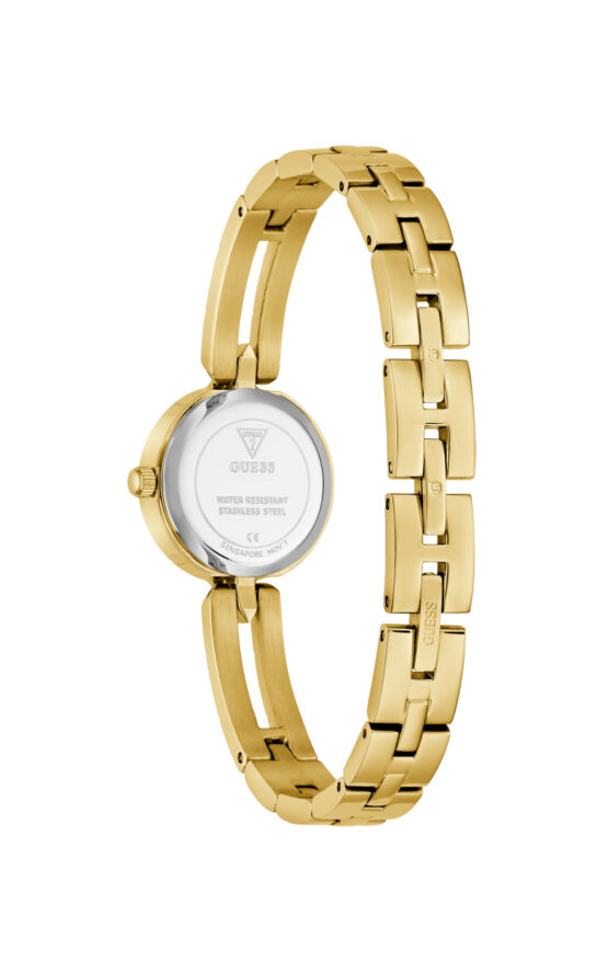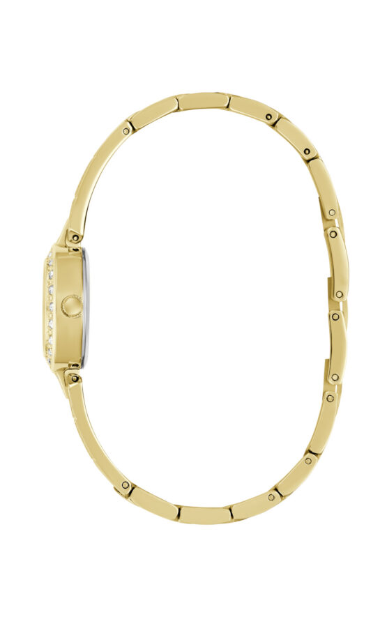 Γυναικείο ρολόι διαμέτρου 23mm με μηχανισμό QUARTZ ακριβείας. Έχει λευκό καντράν με χρυσούς δείκτες και λεπτομέρειες και είναι διακοσμημένο με πέτρες. Η κάσα του είναι χρυσή από ανακυκλωμένο ατσάλι και έχει κρύσταλλο από ορυκτό κρύσταλλο ειδικής σκλήρυνσης. Έχει μπρασελέ από ανακυκλωμένο ατσάλι με κούμπωμα G-LINK. Δεν είναι αδιάβροχο.