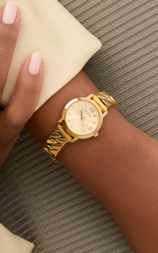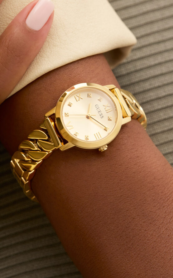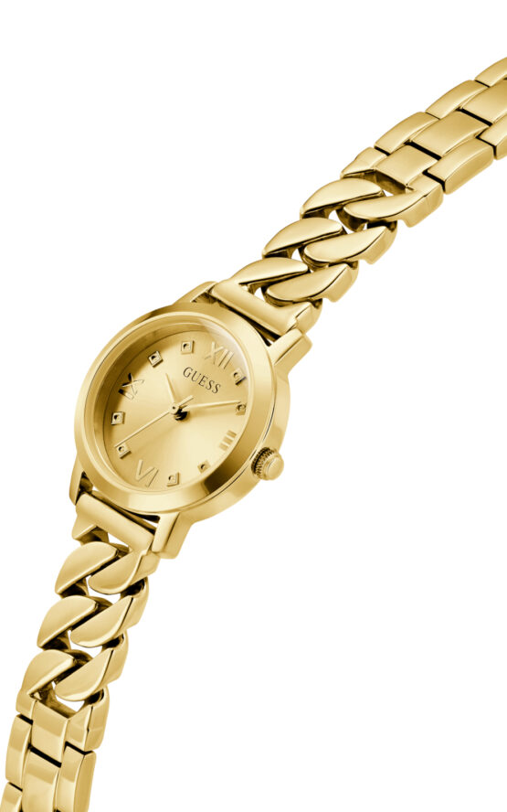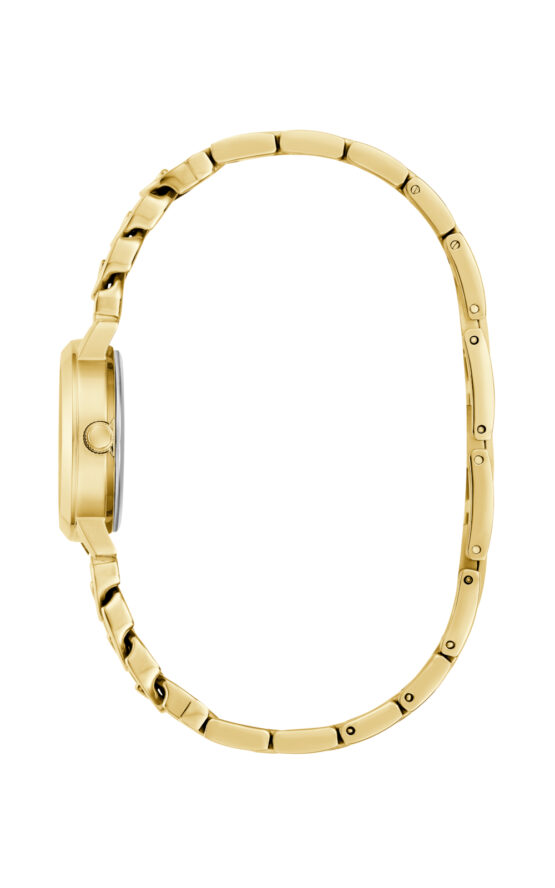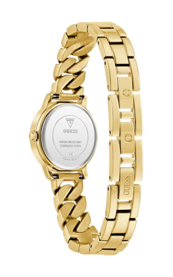 Γυναικείο ρολόι GUESS CHIME GW0867L2 διαμέτρου 25mm, με μηχανισμό QUARTZ ακριβείας, χρυσό καντράν, κάσα και μπρασελέ από ανακυκλωμένο ατσάλι.