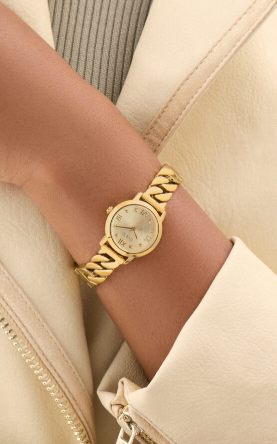Γυναικείο ρολόι διαμέτρου 25mm με μηχανισμό QUARTZ ακριβείας. Έχει χρυσό καντράν με χρυσούς δείκτες και λεπτομέρειες. Η κάσα του είναι από ανακυκλωμένο ατσάλι με κρύσταλλο από ορυκτό κρύσταλλο ειδικής σκλήρυνσης. Έχει μπρασελέ από ανακυκλωμένο ατσάλι και κούμπωμα G-Link. Δεν είναι αδιάβροχο.