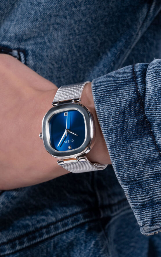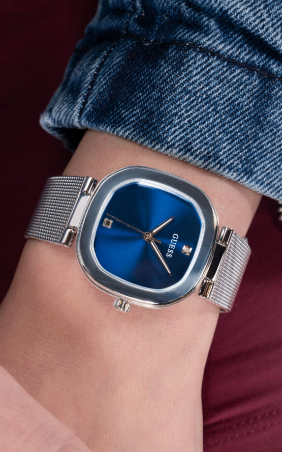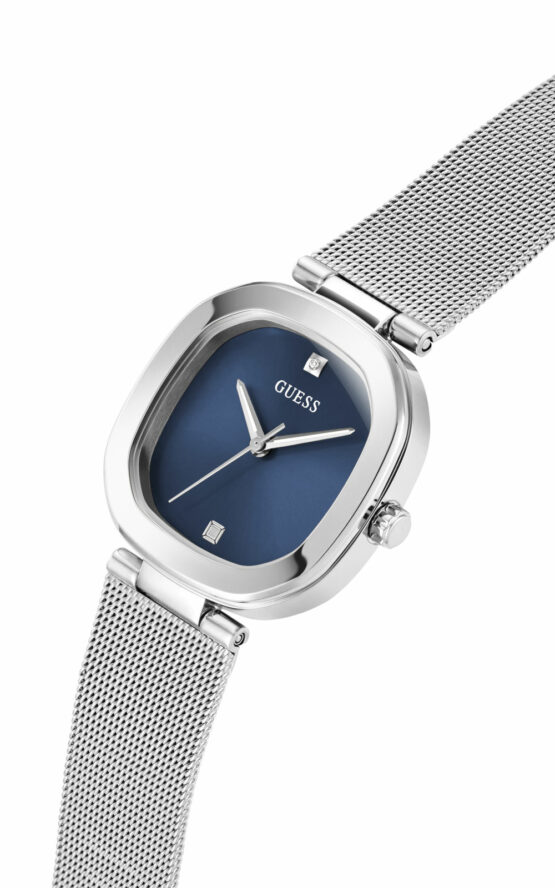 Γυναικείο ρολόι GUESS EVE GW0768L1 διαμέτρου 32mm, με μηχανισμό QUARTZ ακριβείας, μπλε καντράν και μπρασελέ από ανακυκλωμένο ατσάλι.