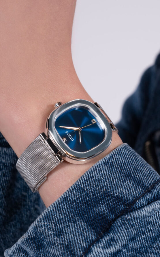 Γυναικείο ρολόι διαμέτρου 32mm με μηχανισμό QUARTZ ακριβείας. Έχει μπλε καντράν με διάφανη πέτρα ζιργκόν και ασημί δείκτες. Η κάσα του είναι από ανακυκλωμένο ατσάλι με ασημένιες λεπτομέρειες.Έχει ασημένιο μπρασελέ και κούμπωμα κλιπ. Δεν είναι αδιάβροχο.