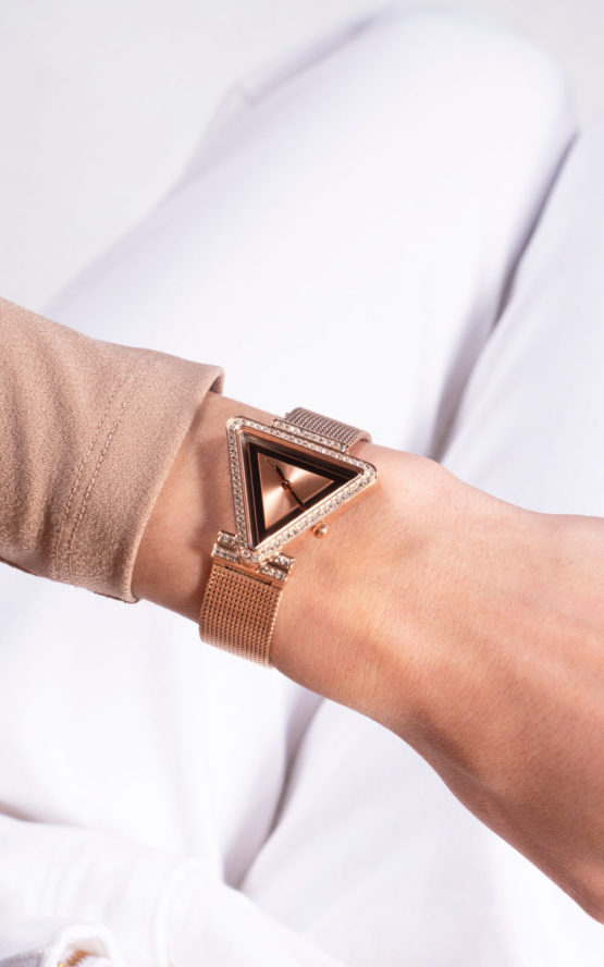 Γυναικείο ρολόι διαμέτρου 34mm με μηχανισμό QUARTZ ακριβείας. Έχει χρυσό καντράν με χρυσούς δείκτες και λεπτομέρειες. Η κάσα του είναι από ανοξείδωτο ατσάλι διακοσμημένη με κρύσταλλα και κρύσταλλο από ορυκτό κρύσταλλο ειδικής σκλήρυνσης. Έχει χρυσό μπρασελέ με κούμπωμα κλιπ.