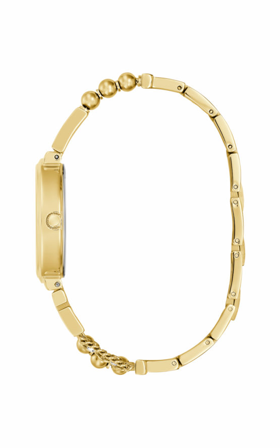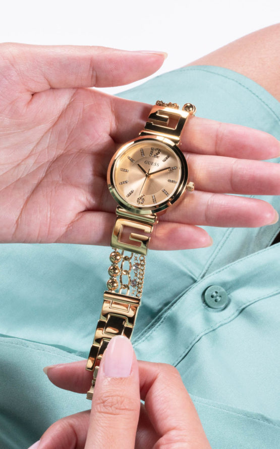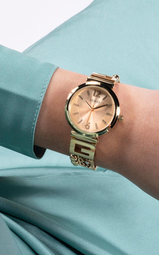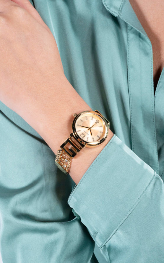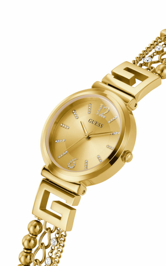 Γυναικείο ρολόι GUESS G CLUSTER GW0545L2 διαμέτρου 32mm, με μηχανισμό QUARTZ ακριβείας, χρυσό καντράν, κάσα και μπρασελέ από ανοξείδωτο ατσάλι.