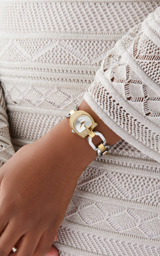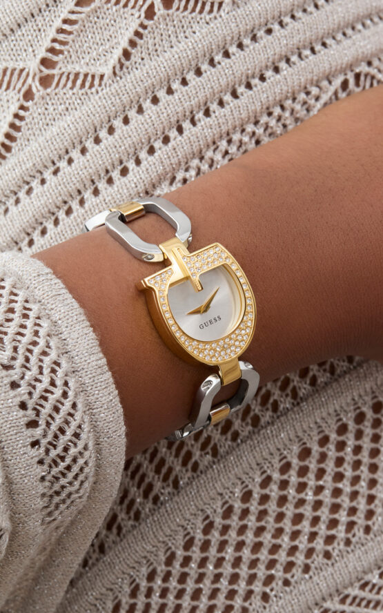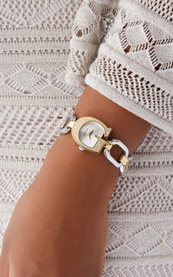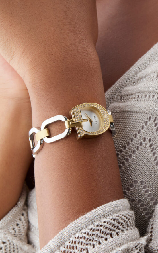 Γυναικείο ρολόι διαμέτρου 22mm με μηχανισμό QUARTZ ακριβείας. Έχει ασημένιο καντράν και χρυσούς δείκτες . Η κάσα του είναι από ανακυκλωμένο ατσάλι σε χρώμα χρυσό με λεπτομέρειες, διακοσμημένη με κρυστάλλα και κρύσταλλο από ορυκτό κρύσταλλο ειδικής σκλήρυνσης. Έχει ασημένιο και χρύσο μπρασελέ από ανακυκλωμένο ατσάλι και κούμπωμα G-Link. Δεν είναι αδιάβροχο.