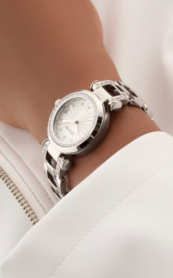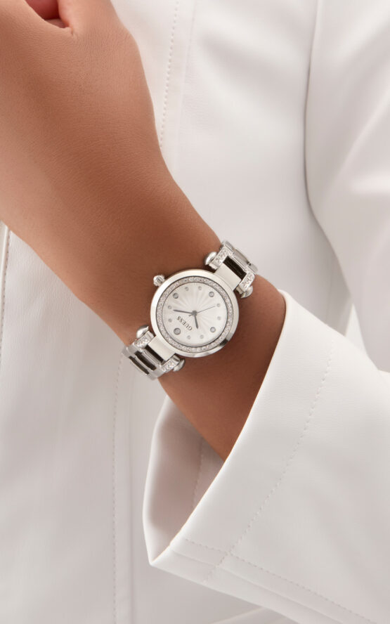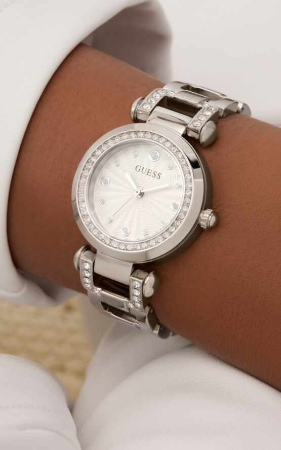 Γυναικείο ρολόι GUESS GINGER GW0869L3 διαμέτρου 30mm, με μηχανισμό QUARTZ ακριβείας, ασημένιο καντράν και μπρασελέ ασημένιο από ανακυκλωμένο ατσάλι.