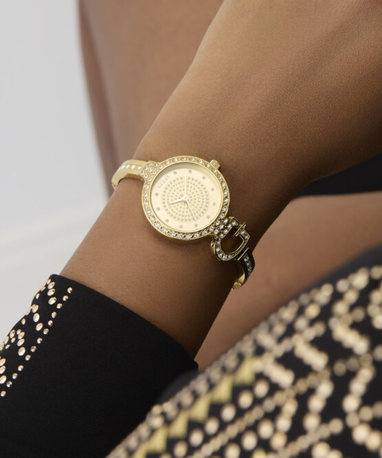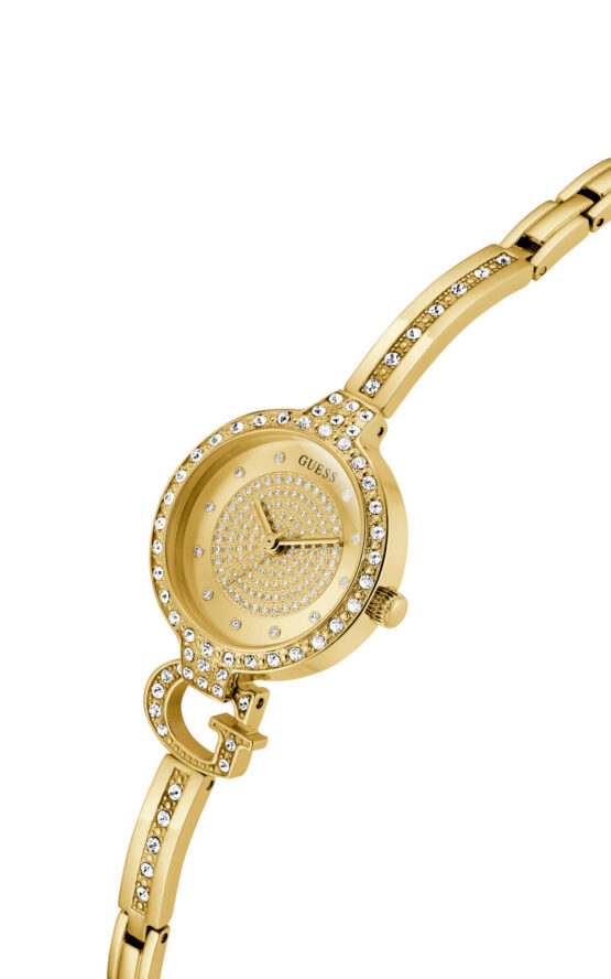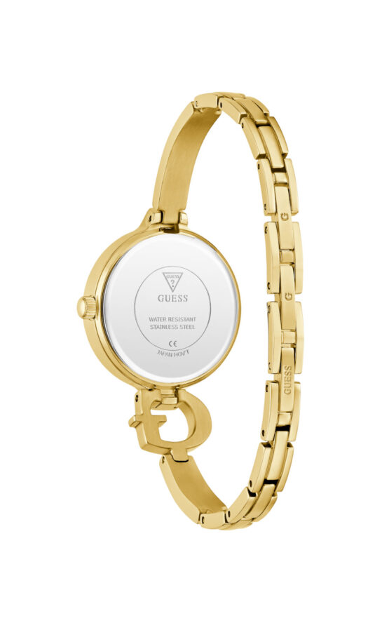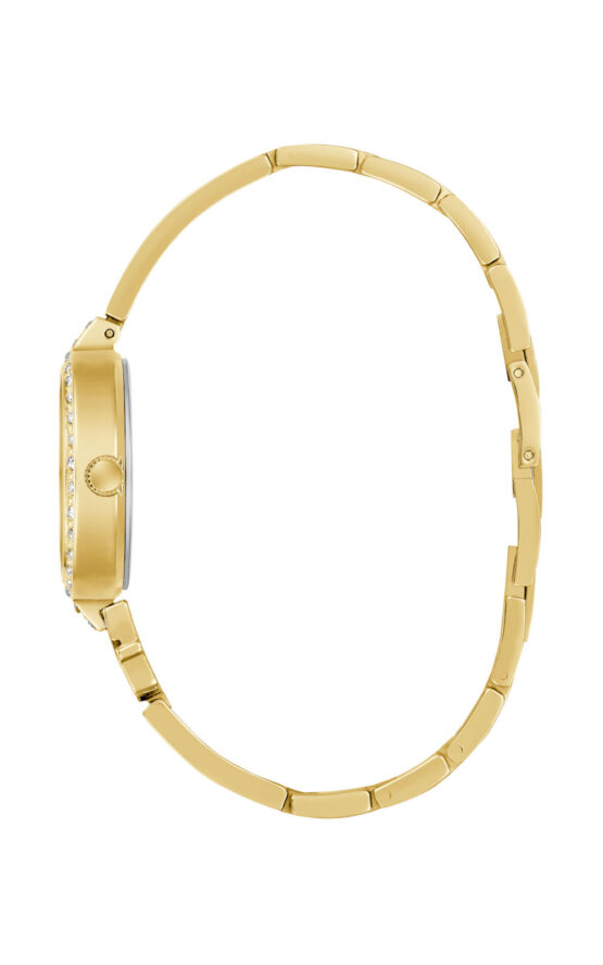 Γυναικείο ρολόι GUESS GISELLE GW0929L2 διαμέτρου 28mm, με μηχανισμό QUARTZ ακριβείας, χρυσό καντράν, κάσα και μπρασελέ από ανακυκλωμένο ατσάλι.
