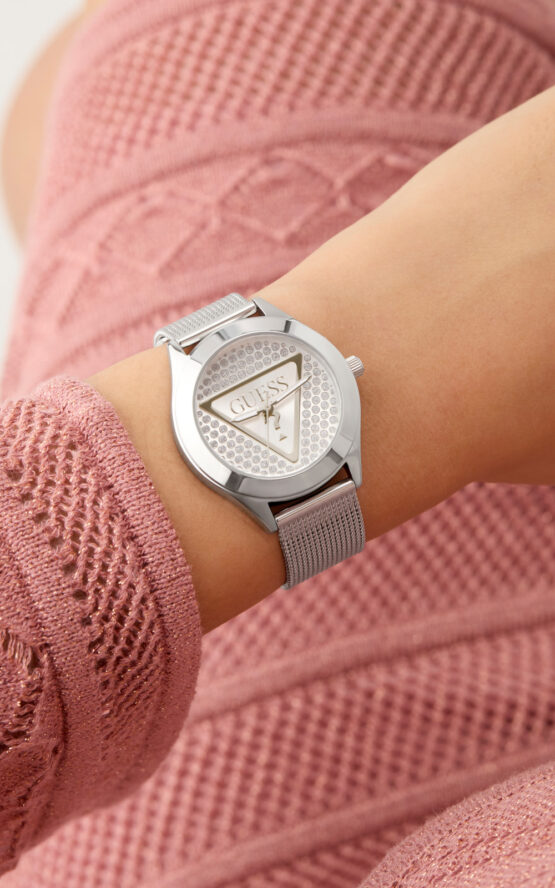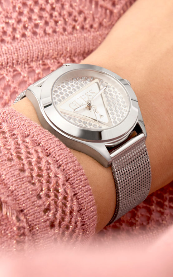 Γυναικείο ρολόι GUESS GLITZ PLAQUE GW0835L1 διαμέτρου 30mm, με μηχανισμό QUARTZ ακριβείας, ασημένιο καντράν και μπρασελέ από ανακυκλωμένο ατσάλι.