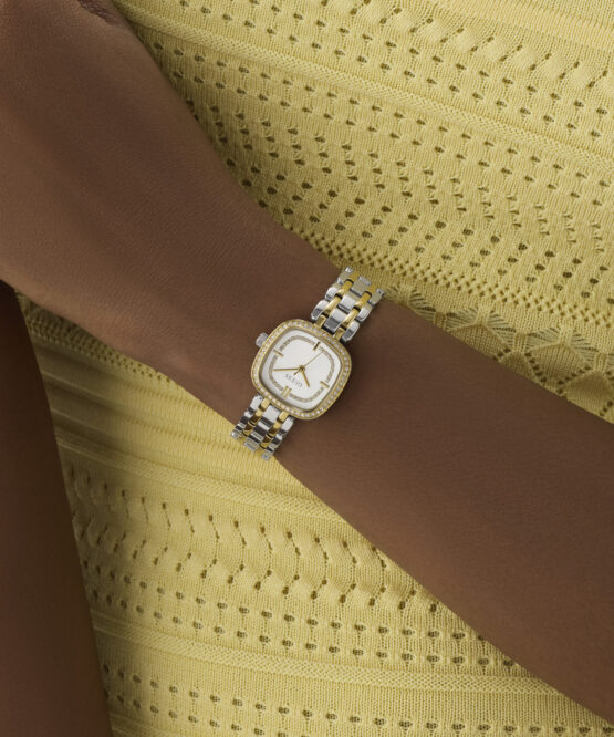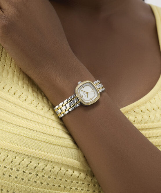 Γυναικείο ρολόι διαμέτρου 25mm με μηχανισμό QUARTZ ακριβείας. Έχει λευκό καντράν με χρυσούς δείκτες και λεπτομέρειες και είναι διακοσμημένο με πέτρες. Η κάσα του είναι χρυσή από ανακυκλωμένο ατσάλι και έχει κρύσταλλο από ορυκτό κρύσταλλο ειδικής σκλήρυνσης. Έχει μπρασελέ από ανακυκλωμένο ατσάλι με κούμπωμα G-LINK. Είναι αδιάβροχο(5ΑΤΜ).