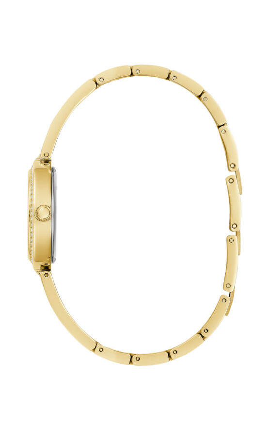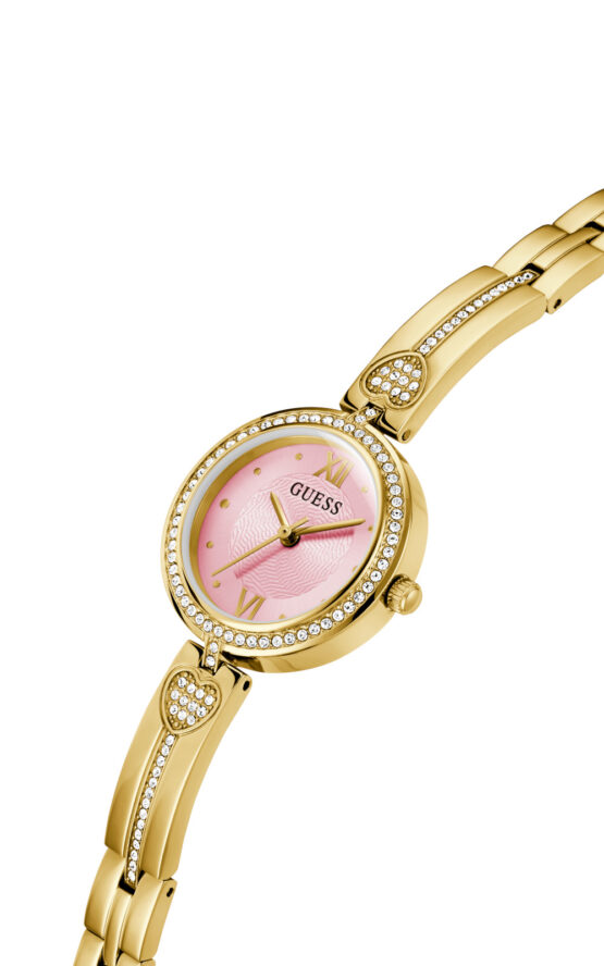 Γυναικείο ρολόι διαμέτρου 27mm με μηχανισμό QUARTZ ακριβείας. Έχει ροζ καντράν με χρυσούς δείκτες και λεπτομέρειες και είναι διακοσμημένο με πέτρες. Η κάσα του είναι από ανακυκλωμένο ατσάλι με κρύσταλλο από ορυκτό κρύσταλλο ειδικής σκλήρυνσης. Έχει μπρασελέ από ανακυκλωμένο ατσάλι και κούμπωμα G-LINK. Δεν είναι αδιάβροχο.