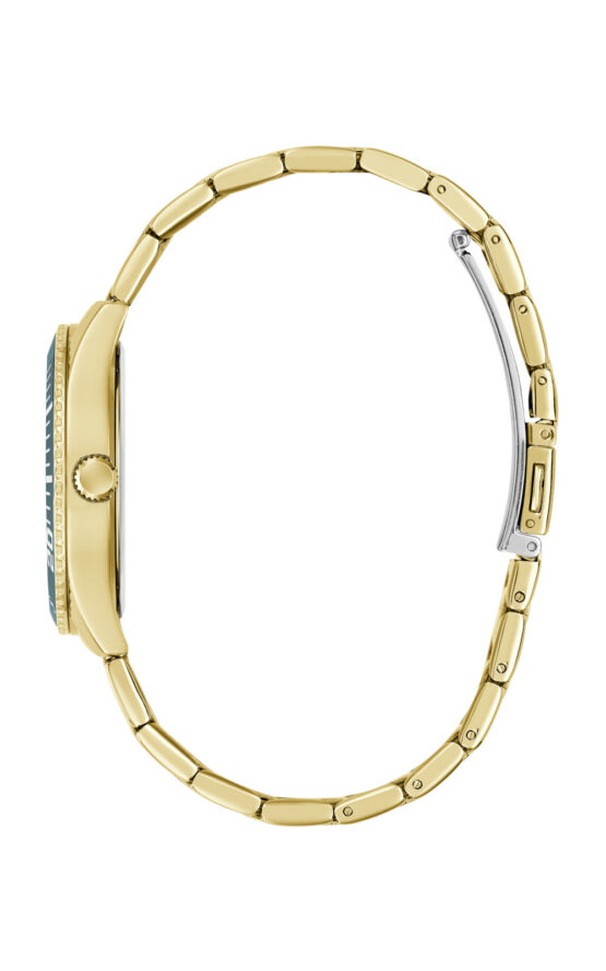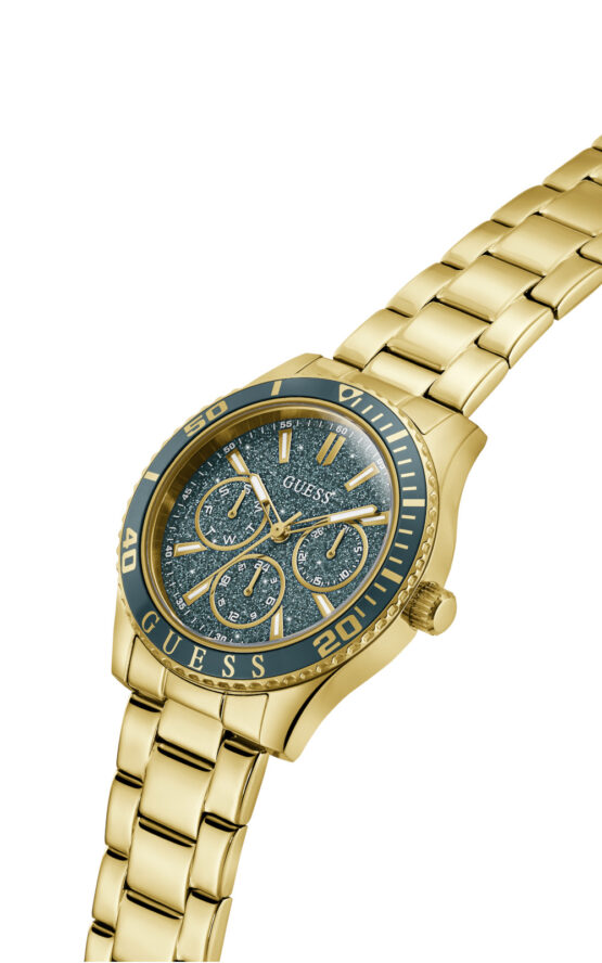Γυναικείο ρολόι GUESS MARIANA GW1035L2 διαμέτρου 36mm, με μηχανισμό QUARTZ multifuction ακριβείας, πράσινο καντράν,κάσα και μπρασελέ από ανακυκλωμένο ατσάλι και κούμπωμα ασφαλείας.