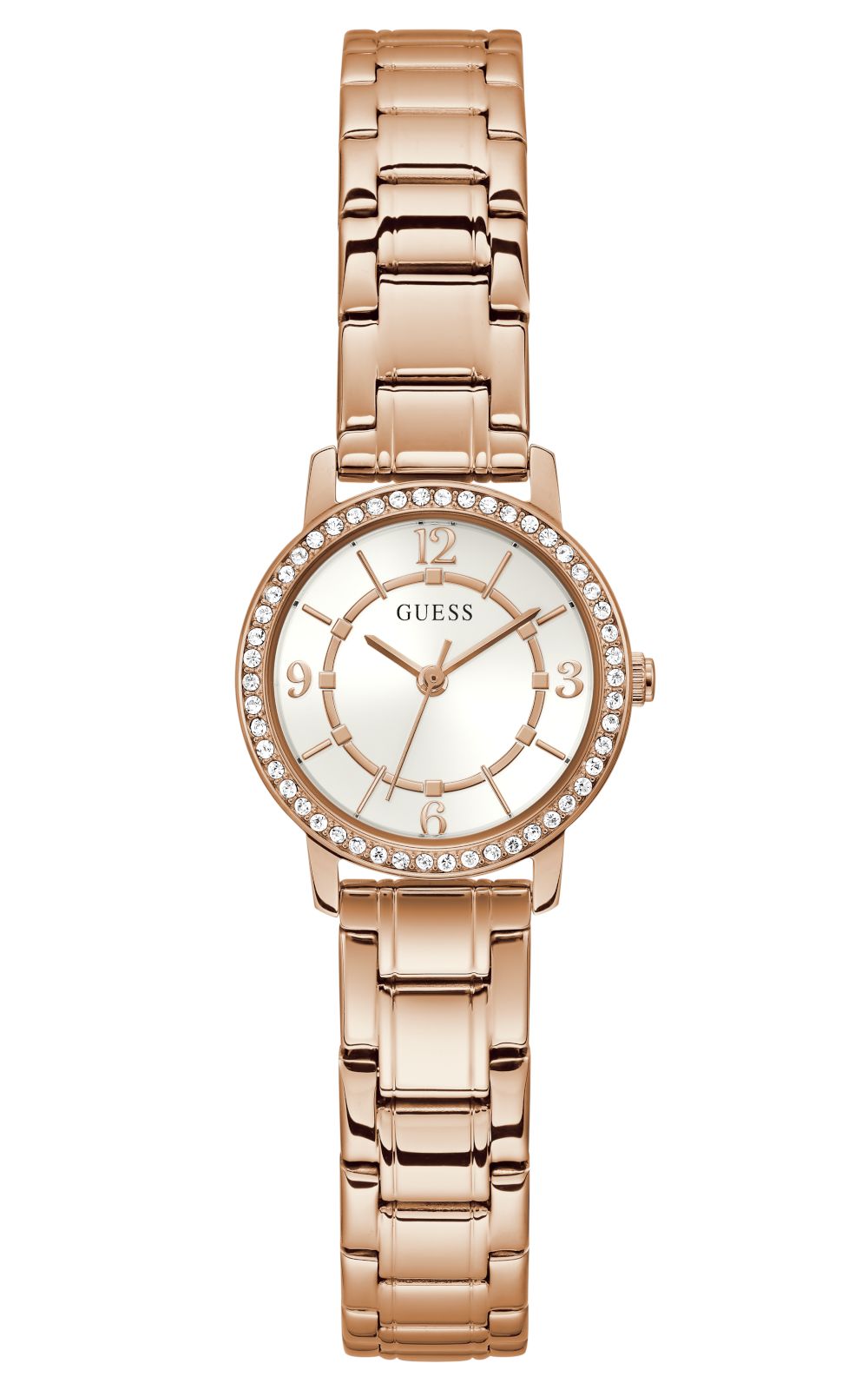 Γυναικείο ρολόι GUESS MELODY GW0468L3 διαμέτρου 28mm, με μηχανισμό QUARTZ ακριβείας, λευκό καντράν, ροζ επίχρυση κάσα και μπρασελέ από ανοξείδωτο ατσάλι.