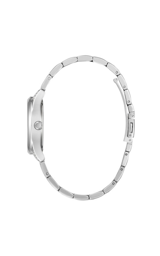 Γυναικείο ρολόι διαμέτρου 31mm με μηχανισμό QUARTZ ακριβείας. Έχει ασημένιο καντράν διακοσμημένο με κρυστάλλους, ασημένιους δείκτες και λεπτομέρειες. Η κάσα του είναι από ανοξείδωτο ατσάλι, διακοσμημένη με κρύσταλλα και κρύσταλλο από ορυκτό κρύσταλλο ειδικής σκλήρυνσης. Έχει μπρασελέ από ανοξείδωτο ατσάλι με κούμπωμα ασφαλείας. Δεν είναι αδιάβροχο.