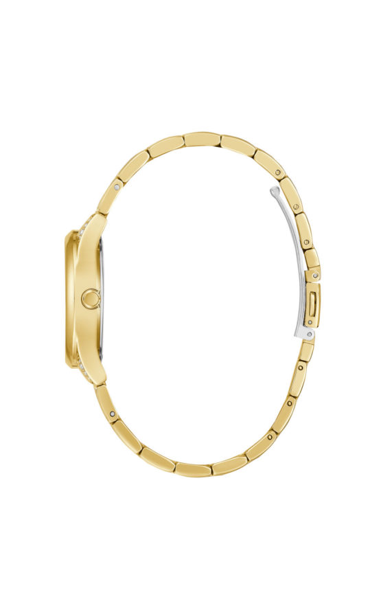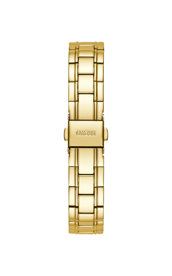 Γυναικείο ρολόι GUESS MINI AURA GW0385L2 διαμέτρου 31mm, με μηχανισμό QUARTZ ακριβείας, χρυσό καντράν, χρυσή κάσα και μπρασελέ από ανοξείδωτο ατσάλι.