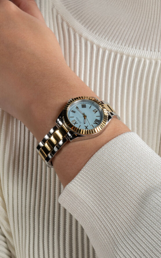 Γυναικείο ρολόι διαμέτρου 30mm με μηχανισμό QUARTZ ακριβείας. Έχει γαλάζιο καντράν με επίχρυσους δείκτες και λεπτομέρειες. Η κάσα του είναι από ανοξείδωτο ατσάλι με επίχρυσες λεπτομέρειες και κρύσταλλο από ορυκτό κρύσταλλο ειδικής σκλήρυνσης. Έχει μπρασελέ από ανοξείδωτο ατσάλι με επίχρυσες λεπτομέρειες και κούμπωμα ασφαλείας. Δεν είναι αδιάβροχο.