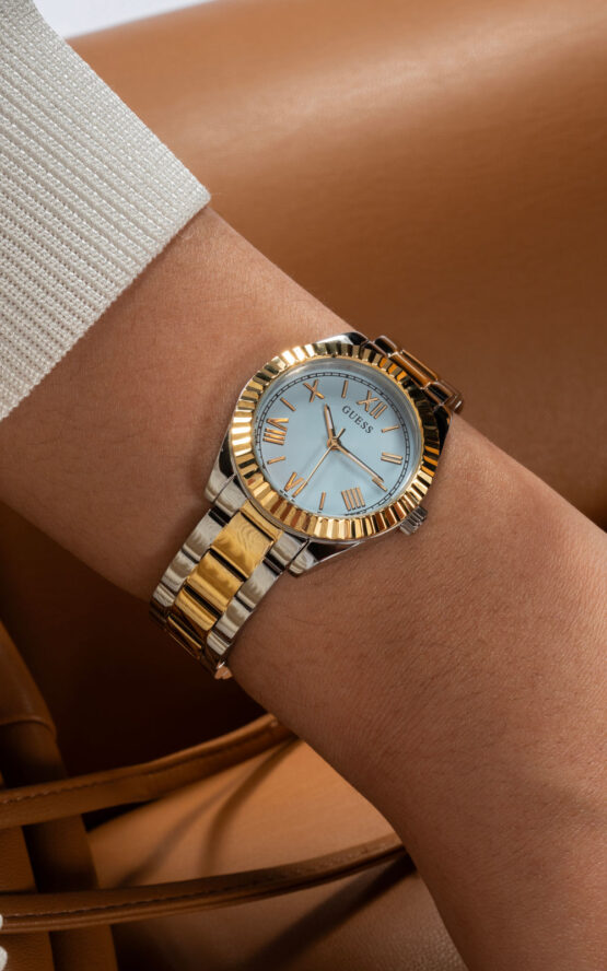 Γυναικείο ρολόι GUESS MINI LUNA GW0687L4 διαμέτρου 30mm, με μηχανισμό QUARTZ ακριβείας, γαλάζιο καντράν, κάσα και μπρασελέ από ανοξείδωτο ατσάλι.