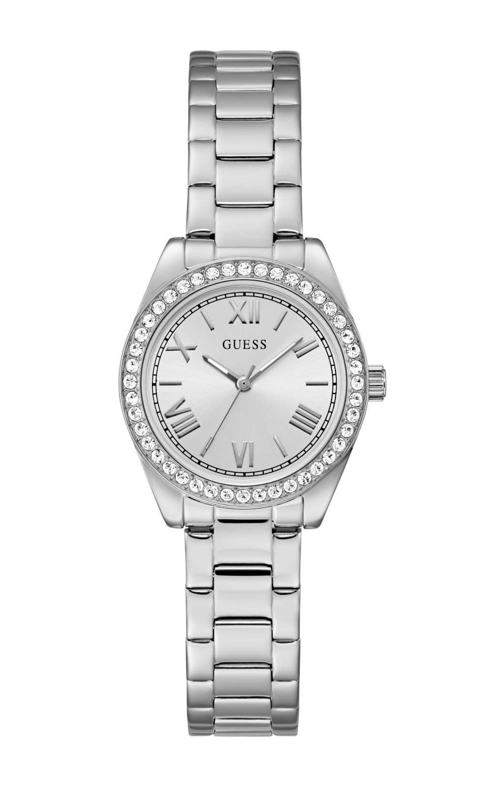 Γυναικείο ρολόι GUESS MINI LUNA GW0841L6 διαμέτρου 30mm, με μηχανισμό QUARTZ ακριβείας, ασημί καντράν, κάσα και μπρασελέ από ανακυκλωμένο ατσάλι.