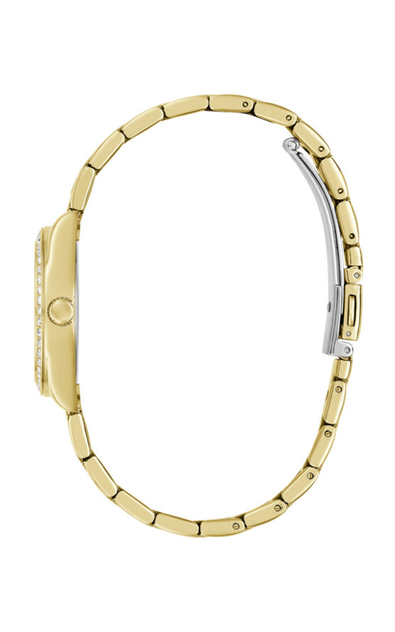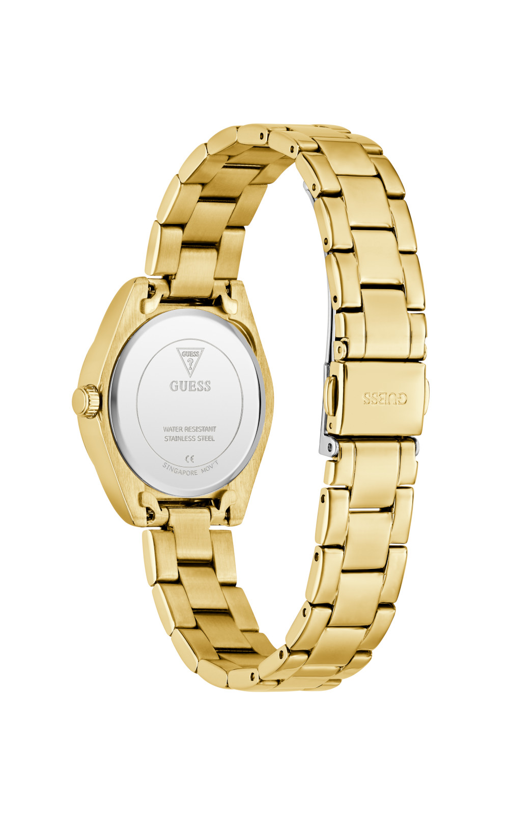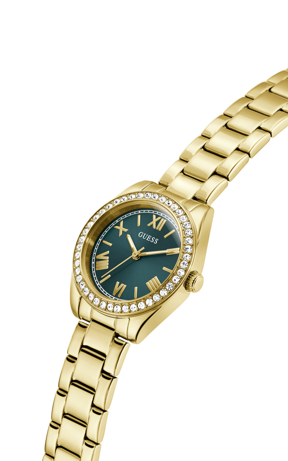 Γυναικείο ρολόι GUESS MINI LUNA GW0841L9 διαμέτρου 30mm, με μηχανισμό QUARTZ ακριβείας, πράσινο καντράν,κάσα και μπρασελέ από ανακυκλωμένο ατσάλι και κούμπωμα ασφαλείας.