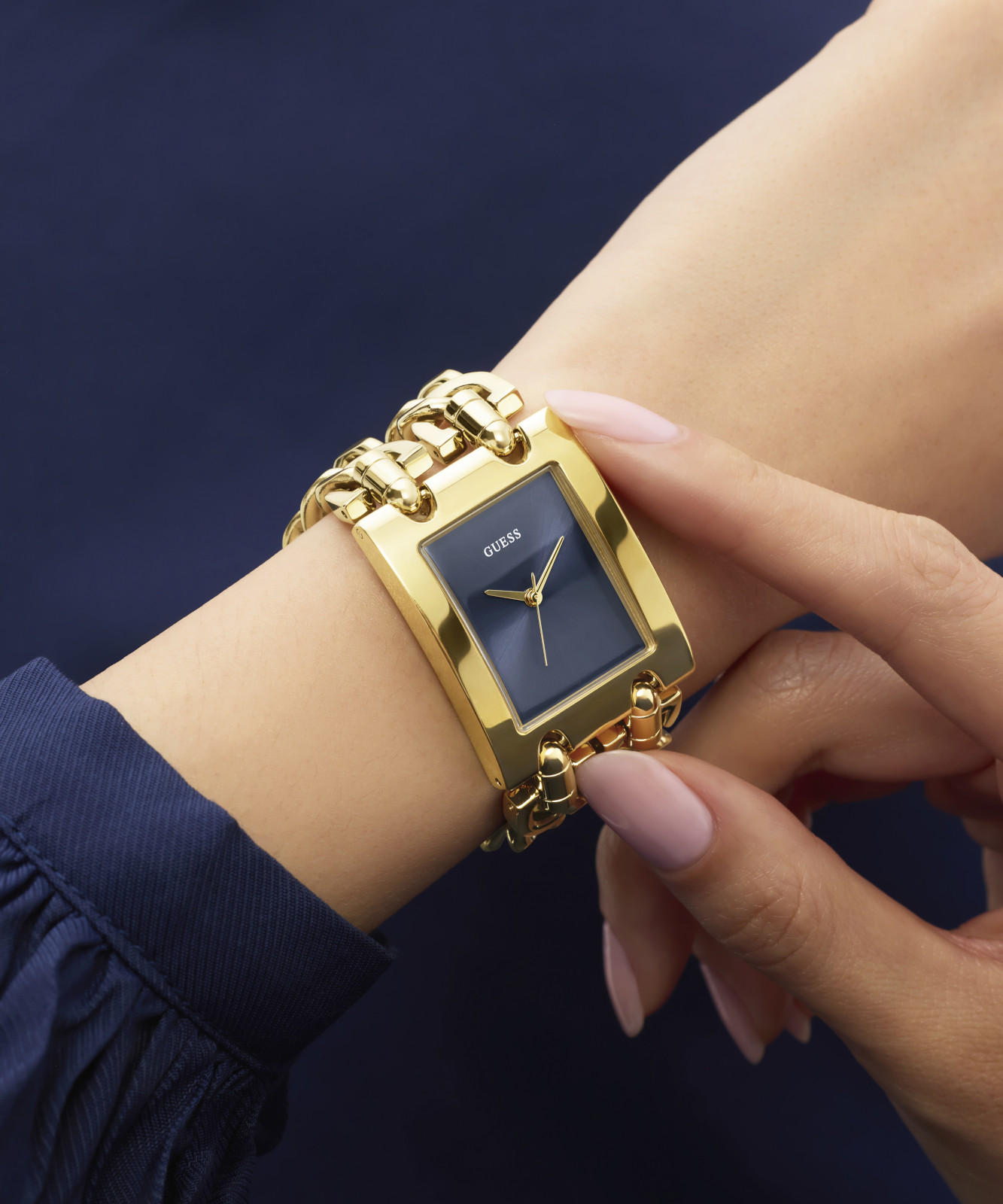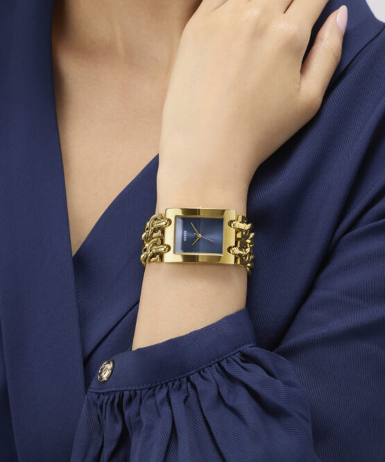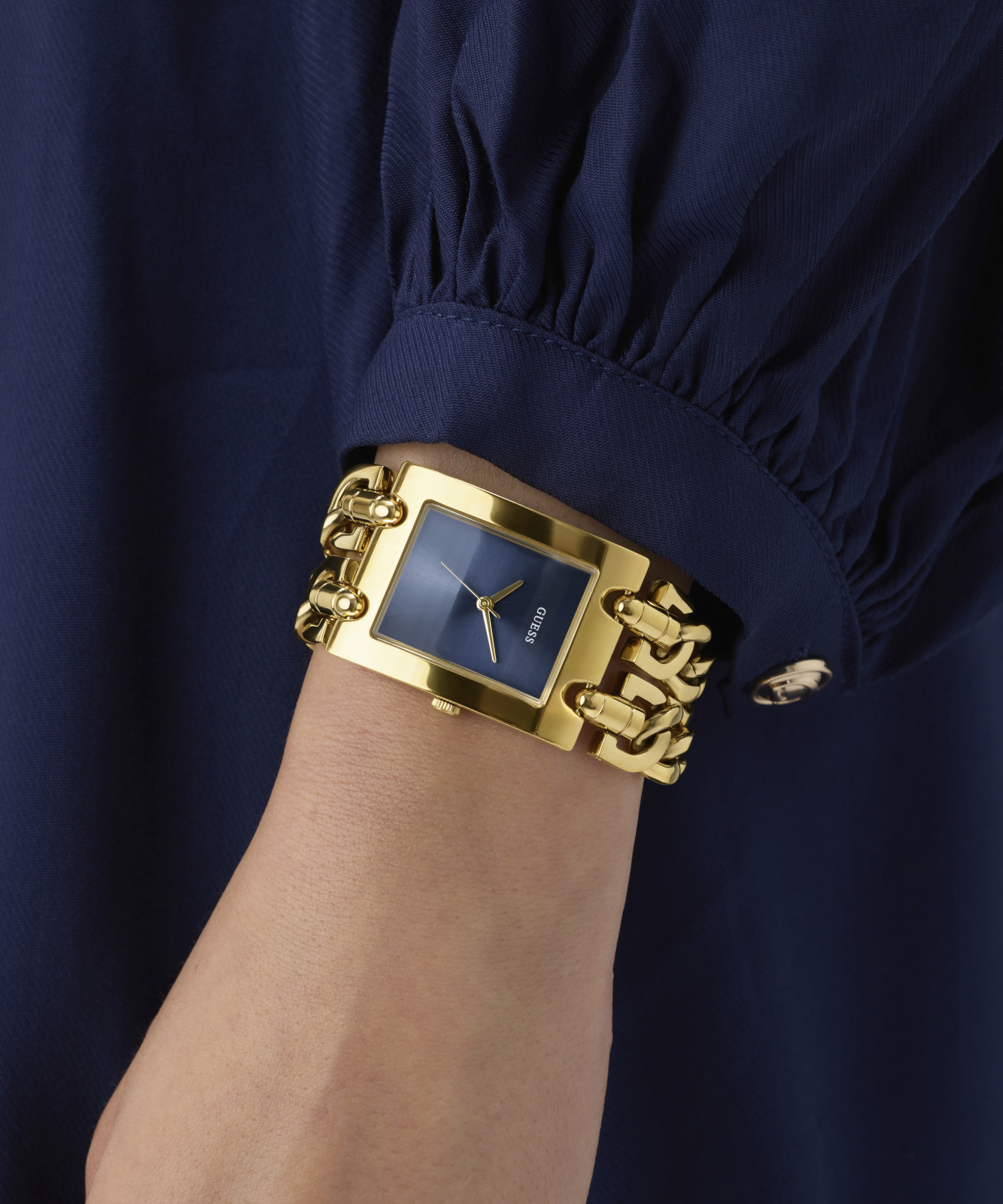 Γυναικείο ρολόι διαμέτρου 28x26mm με μηχανισμό QUARTZ ακριβείας. Έχει μπλε καντράν με χρυσούς δείκτες και λεπτομέρειες. Η κάσα του είναι από ανακυκλωμένο ατσάλι με κρύσταλλο από ορυκτό κρύσταλλο ειδικής σκλήρυνσης. Έχει μπρασελέ από ανακυκλωμένο ατσάλι και κούμπωμα G-LINK. Είναι αδιάβροχο 5 ATM.