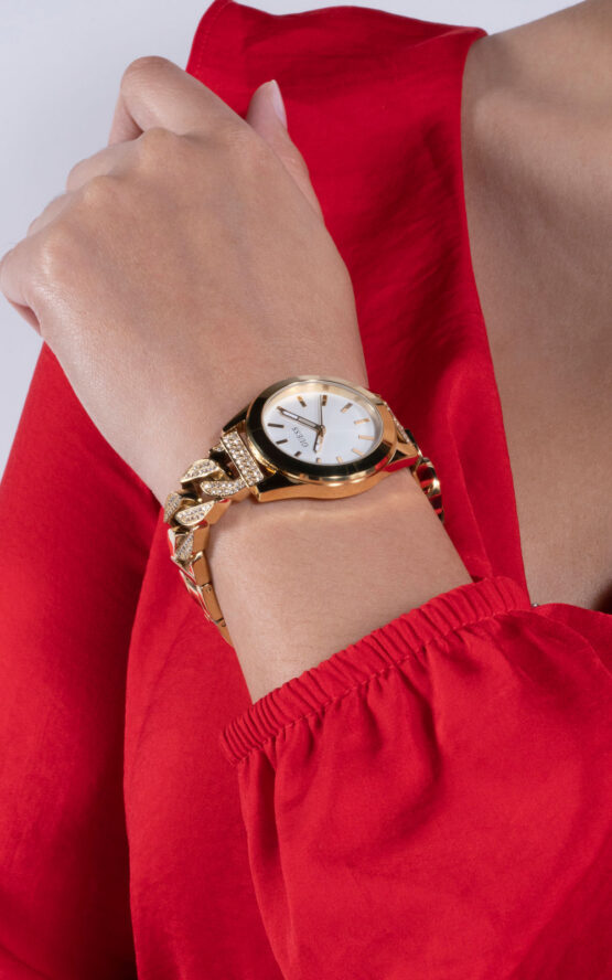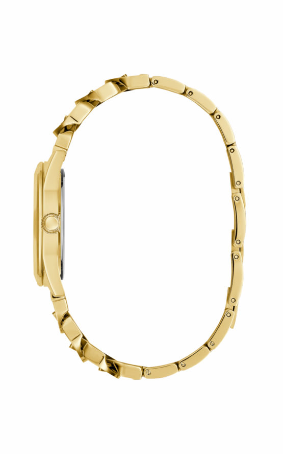 Γυναικείο ρολόι διαμέτρου 32mm, με μηχανισμό QUARTZ ακριβείας. Έχει χρυσό καντράν, χρυσούς δείκτες και λεπτομέρειες. Η κάσα του είναι χρυσή από ανοξείδωτο ατσάλι με κρύσταλλο από ορυκτό κρύσταλλο ειδικής σκλήρυνσης. Έχει χρυσό μπρασελέ από ανοξείδωτο ατσάλι διακοσμημένο με κρυστάλλους και κούμπωμα G-LINK. Δεν είναι αδιάβροχο.