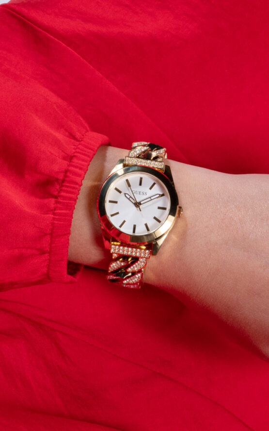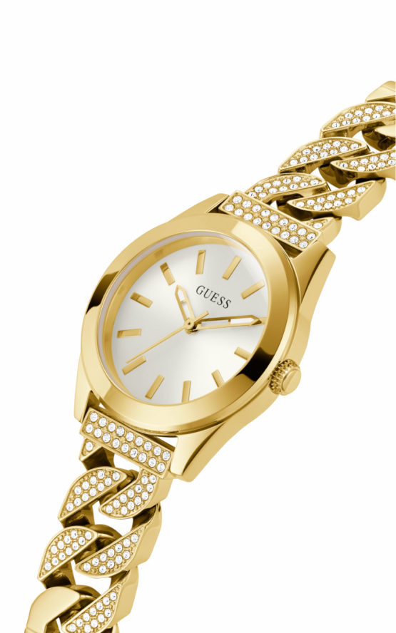 Γυναικείο ρολόι GUESS SERENA GW0546L2 διαμέτρου 32mm, με μηχανισμό Quartz Ακριβείας, χρυσό καντράν, κάσα και μπρασελέ από ανοξείδωτο ατσάλι.