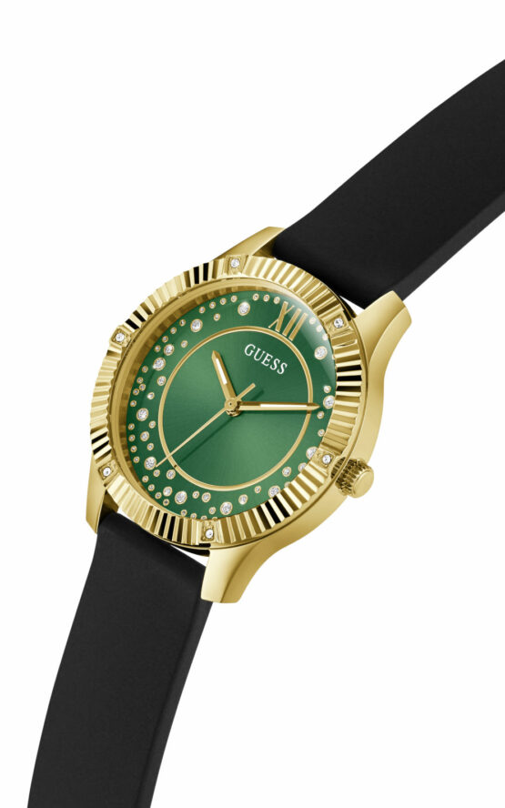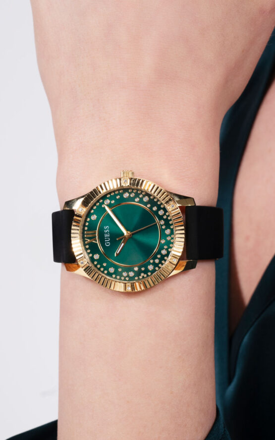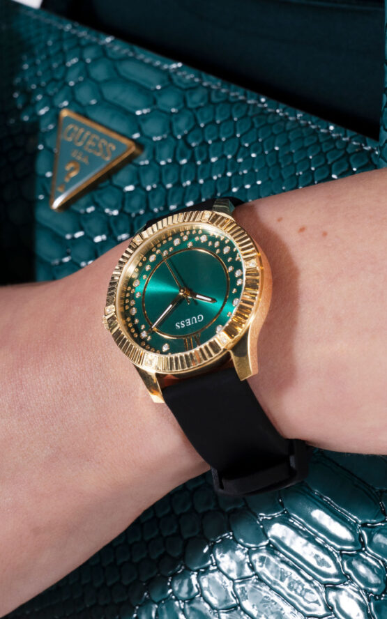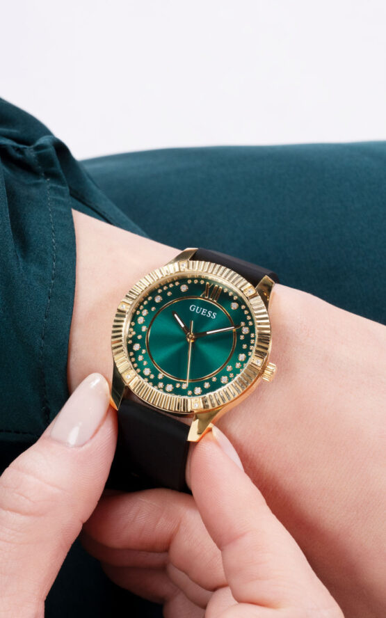Γυναικείο ρολόι διαμέτρου 34mm με μηχανισμό QUARTZ ακριβείας. Έχει πράσινο καντράν με διαφανείς πέτρες ζιργκόν και επίχρυσους δείκτες. Η κάσα του είναι από ανακυκλωμένο ατσάλι με χρυσές λεπτομέρειες.Έχει λουράκι από καουτσούκ και κούμπωμα τοκάς. Δεν είναι αδιάβροχο.