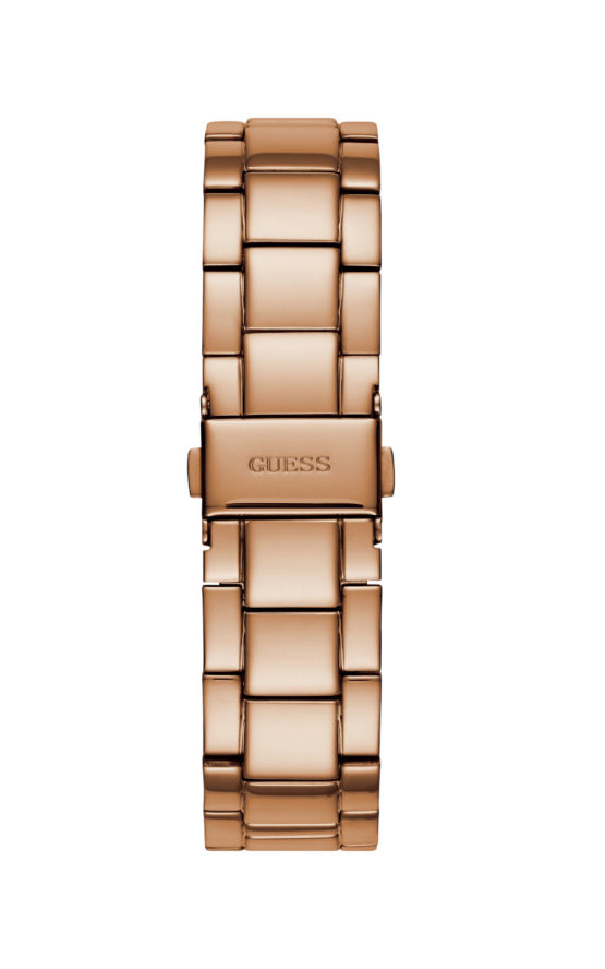 Γυναικείο ρολόι GUESS SOLAR W1070L3 διαμέτρου 40mm, με μηχανισμό QUARTZ χρονογράφου ακριβείας, ροζ επίχρυσο καντράν και ροζ επίχρυση κάσα και μπρασελέ από ανοξείδωτο ατσάλι.