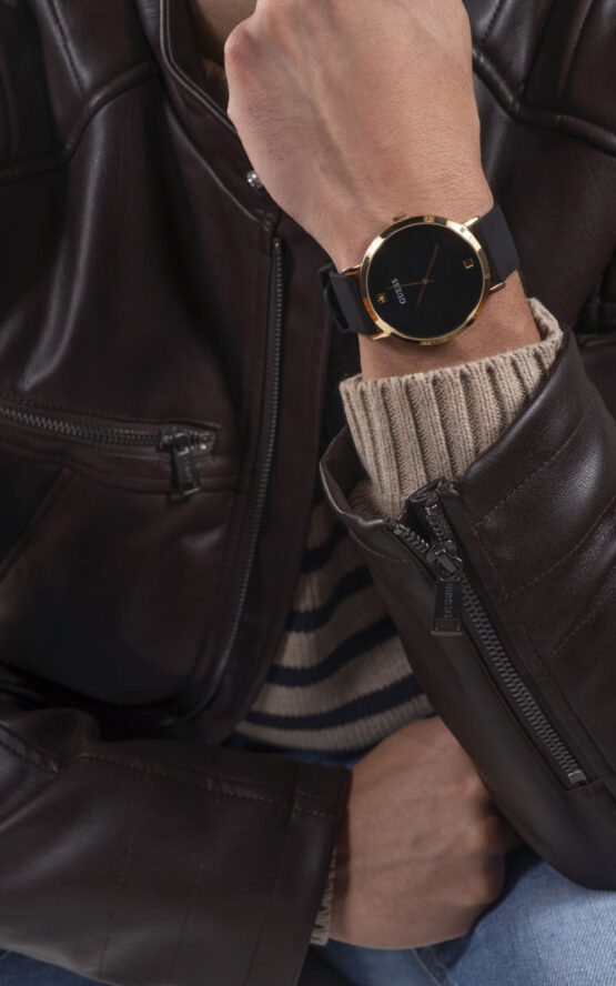 Γυναικείο ρολόι διαμέτρου 44mm με μηχανισμό QUARTZ ακριβείας. Έχει μαύρο καντράν με επίχρυσους δείκτες και λεπτομέρειες. Η κάσα του είναι επίχρυση από ανοξείδωτο ατσάλι με κρύσταλλο από ορυκτό κρύσταλλο ειδικής σκλήρυνσης. Έχει καουτσούκ λουράκι μαύρου χρώματος με κούμπωμα τοκάς. Είναι αδιάβροχο (3 ΑΤΜ).
