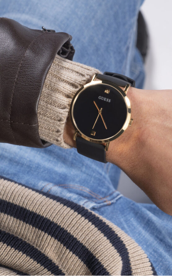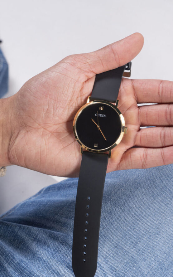 Γυναικείο ρολόι GUESS SUPERNOVA W1264G1 διαμέτρου 44mm, με μηχανισμό QUARTZ ακριβείας, μαύρο καντράν, επίχρυση κάσα από ανοξείδωτο ατσάλι και μαύρο καουτσούκ λουράκι.