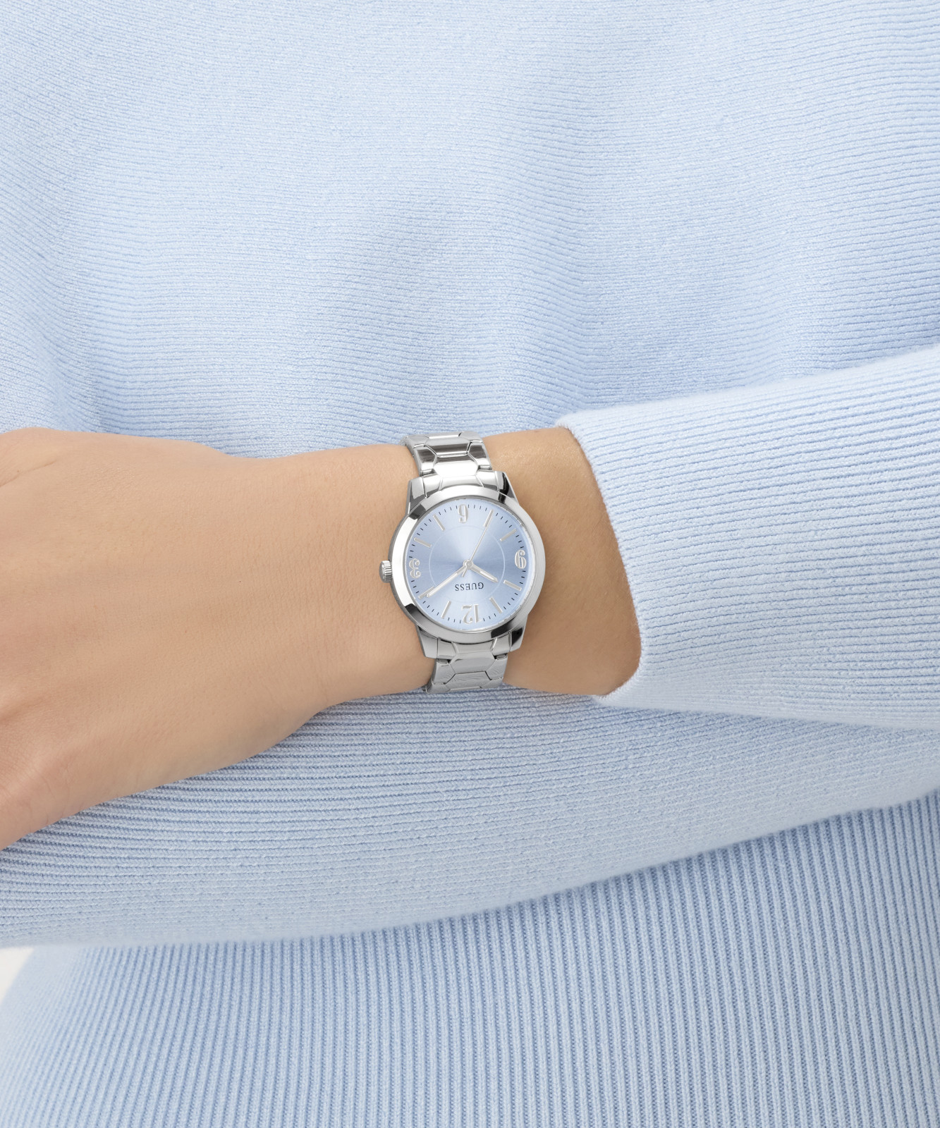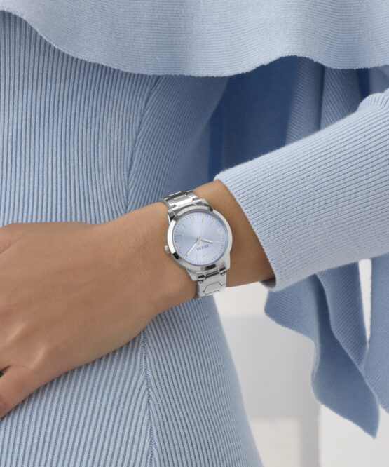Γυναικείο ρολόι GUESS COLETTE GW1028L1 διαμέτρου 34mm, με μηχανισμό QUARTZ ακριβείας, γαλάζιο καντράν,κάσα και μπρασελέ από ανακυκλωμένο ατσάλι και κούμπωμα ασφαλείας.