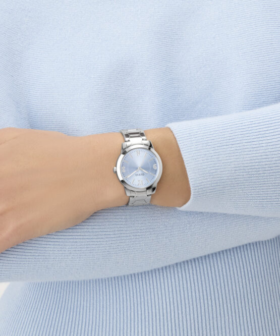 Γυναικείο ρολόι διαμέτρου 34mm με μηχανισμό QUARTZ ακριβείας. Έχει γαλάζιο καντράν με ασημένιους δείκτες και λεπτομέρειες. Η κάσα του είναι ασημένια από ανακυκλωμένο ατσάλι και έχει κρύσταλλο από ορυκτό κρύσταλλο ειδικής σκλήρυνσης. Έχει μπρασελέ από ανακυκλωμένο ατσάλι με κούμπωμα ασφαλείας. Δεν είναι αδιάβροχο.
