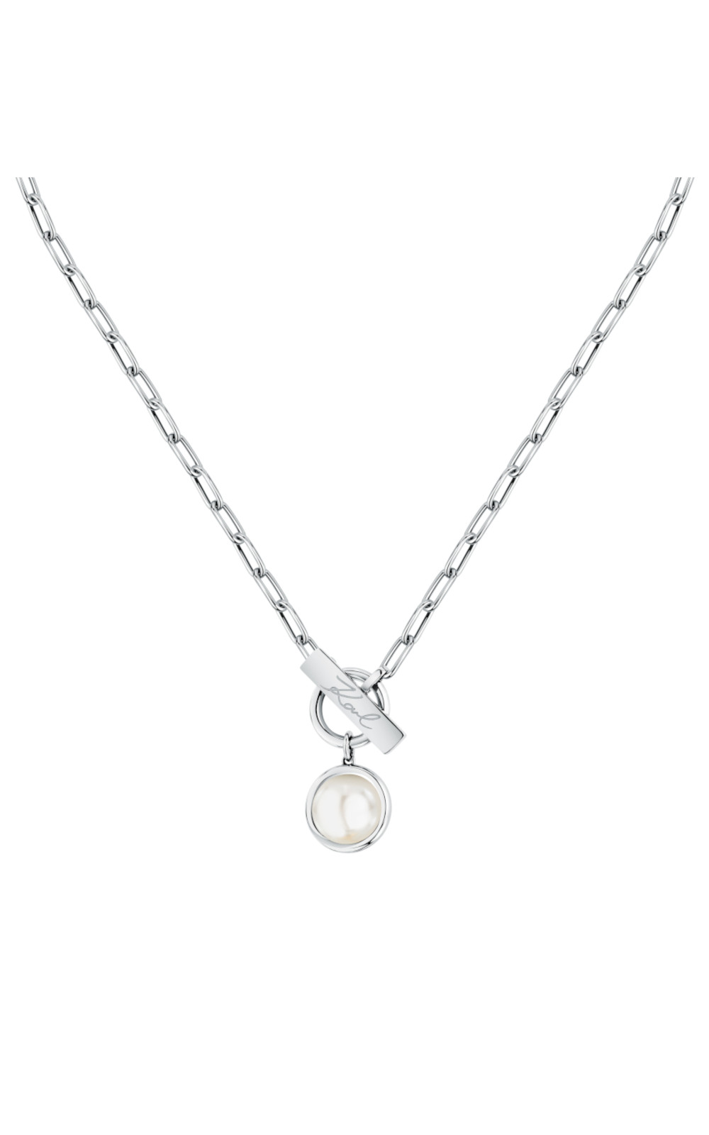 Γυναικείο κολιέ KARL LAGERFELD ασημένιου χρώματος. Είναι κατασκευασμένο από ανοξείδωτο ατσάλι και είναι διακοσμημένο με σχέδιο με πέρλα(40+5cm).