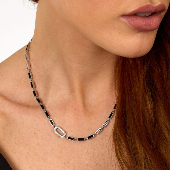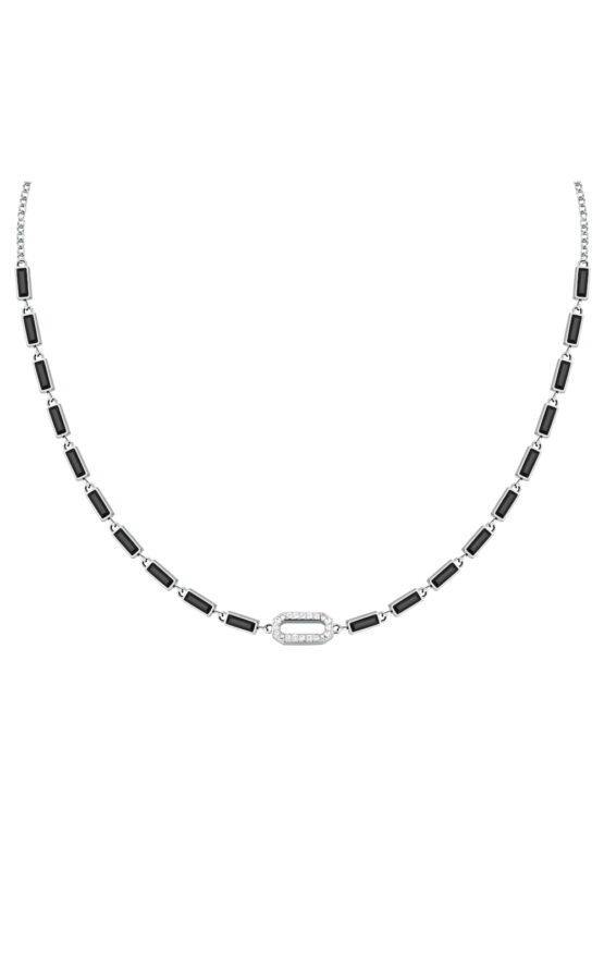 Γυναικείο κολιέ KARL LAGERFELD δίχρωμο, ασημένιου και μαύρου χρώματος με πέτρες. Είναι κατασκευασμένο από ανοξείδωτο ατσάλι και είναι διακοσμημένο με διαφανείς και μαύρες πέτρες και το λογότυπο της εταιρίας(35+10cm).