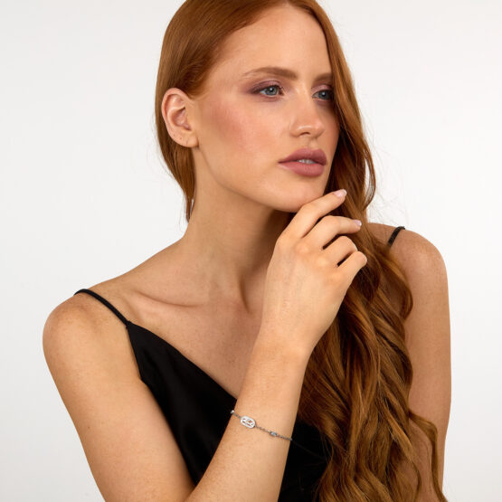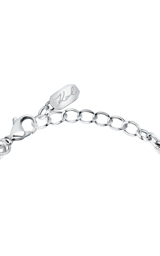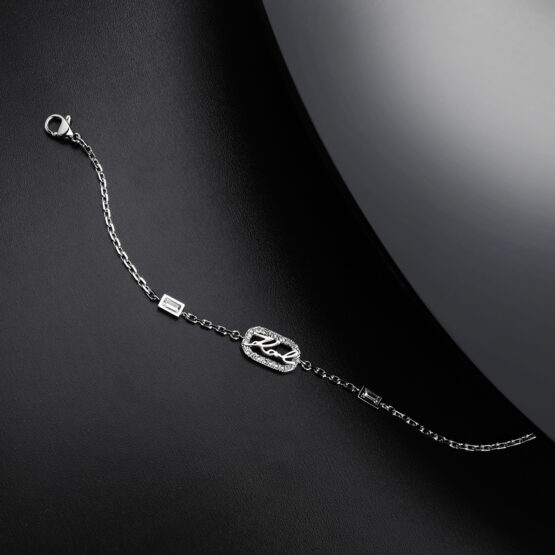 Γυναικείο βραχιόλι KARL LAGERFELD ασημένιου χρώματος με πέτρες. Είναι κατασκευασμένο από ανοξείδωτο ατσάλι και είναι διακοσμημένο με άσπρες πέτρες και λογότυπο(16+3cm).