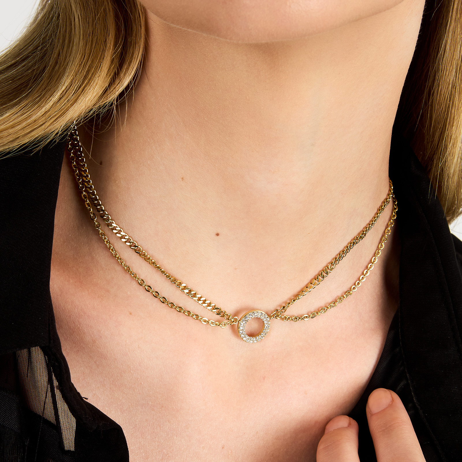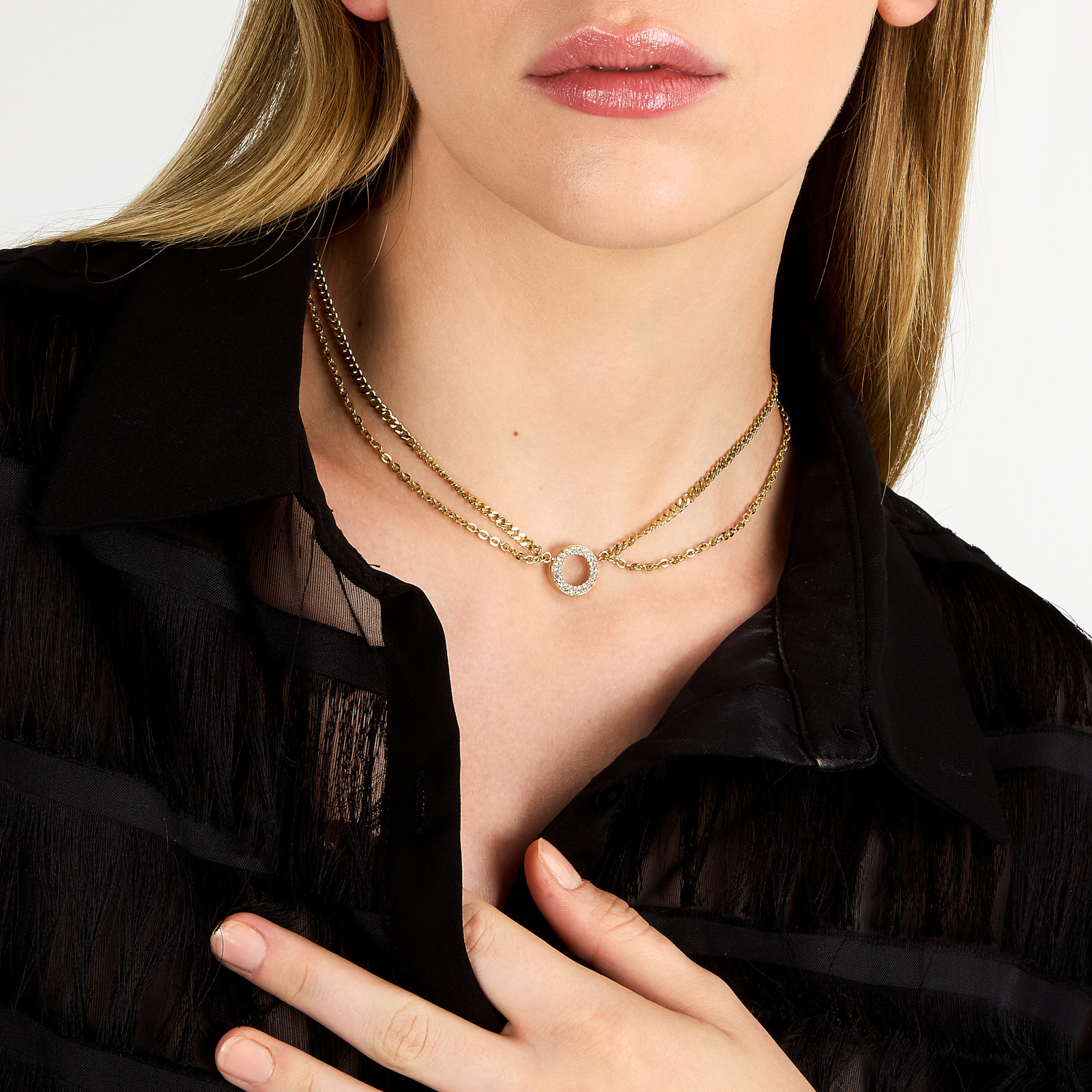 Γυναικείο κολιέ KARL LAGERFELD χρυσού χρώματος με διπλή αλυσίδα. Είναι κατασκευασμένο από ανοξείδωτο ατσάλι και είναι διακοσμημένο με πέτρες(40+5cm).