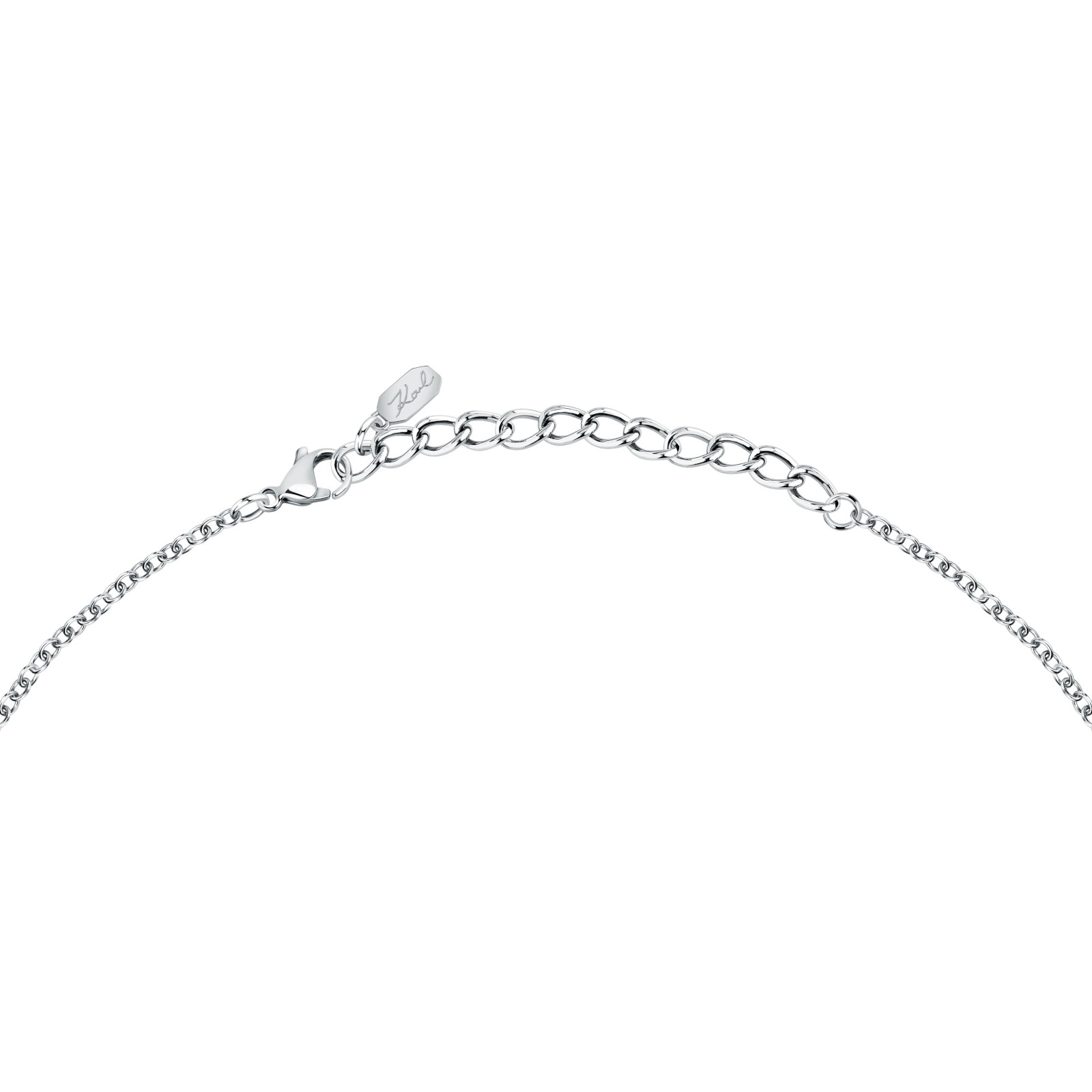 Γυναικείο κολιέ KARL LAGERFELD ασημένιου χρώματος με πέτρες. Είναι κατασκευασμένο από ανοξείδωτο ατσάλι και είναι διακοσμημένο με σχέδιο με άσπρες πέτρες και λογότυπο της εταιρείας(40+5cm).
