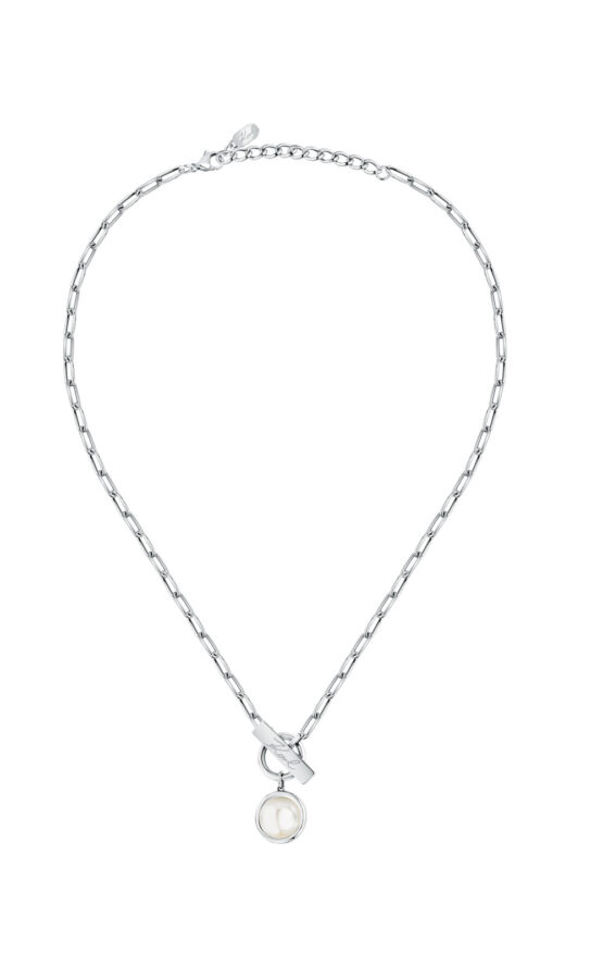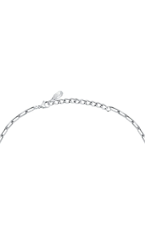 Γυναικείο κολιέ KARL LAGERFELD ασημένιου χρώματος. Είναι κατασκευασμένο από ανοξείδωτο ατσάλι και είναι διακοσμημένο με σχέδιο με πέρλα(40+5cm).