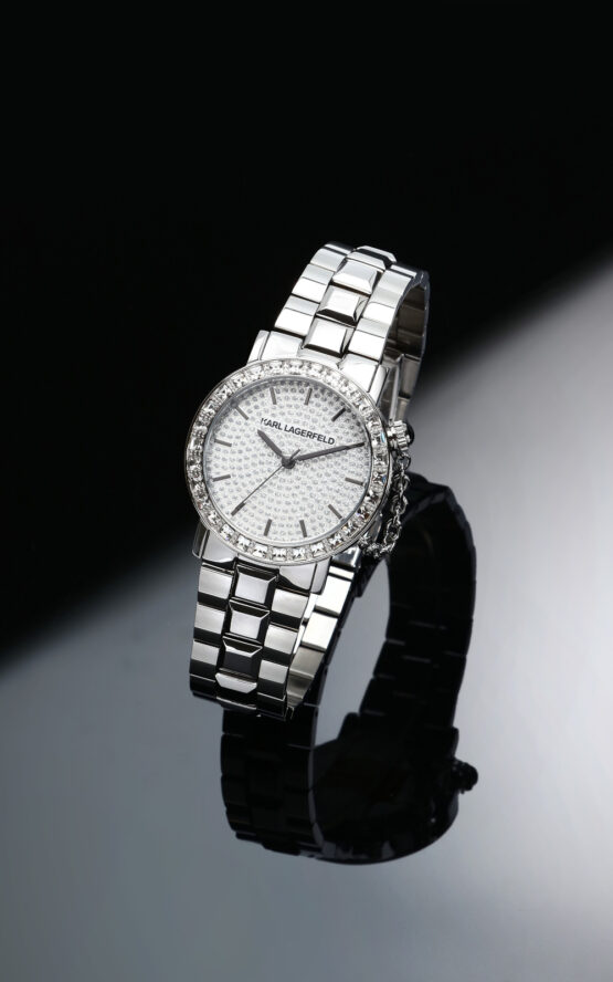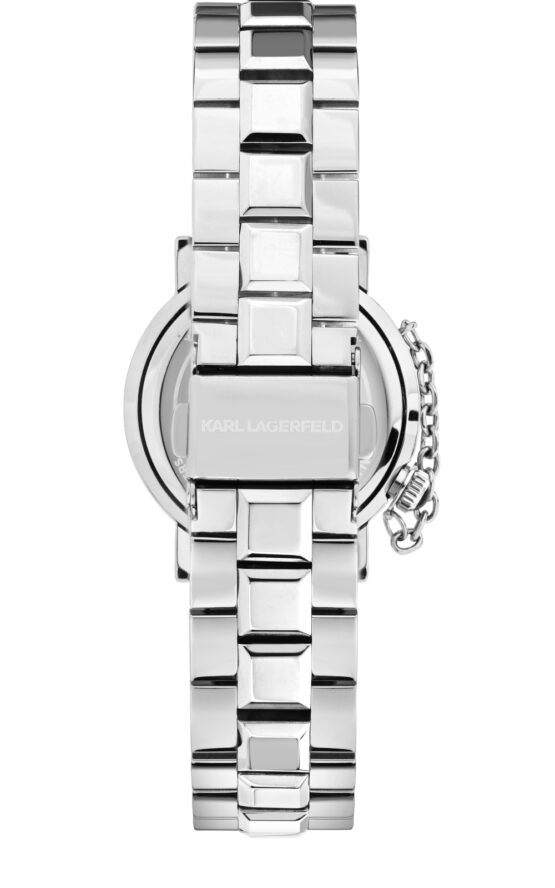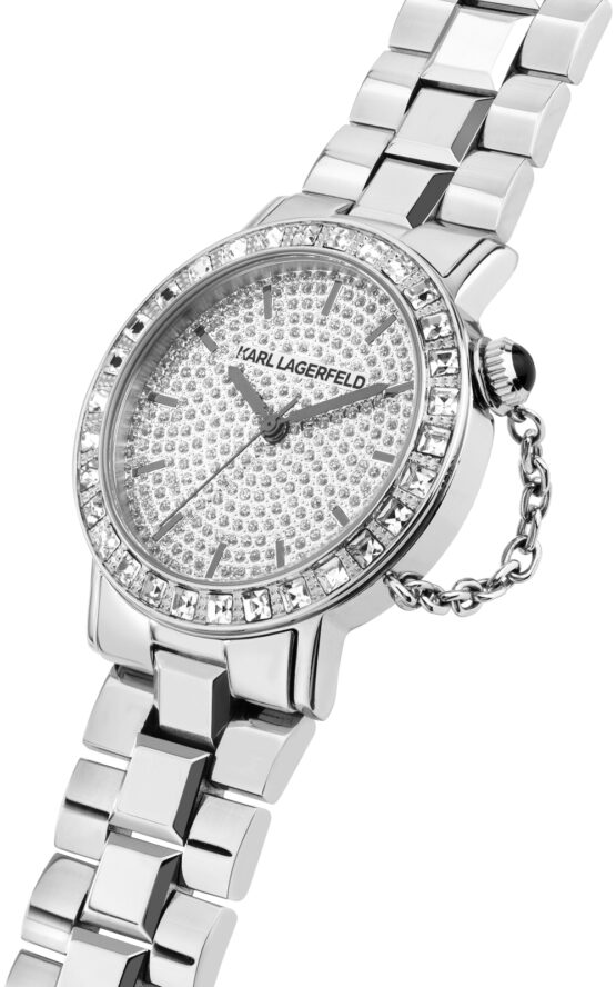 Γυναικείο ρολόι KARL LAGERFELD CRYSTALS R0553100506 διαμέτρου 33mm, με μηχανισμό QUARTZ ακριβείας, ασημένιο καντράν, κάσα και μπρασελέ από ανοξείδωτο ατσάλι.
