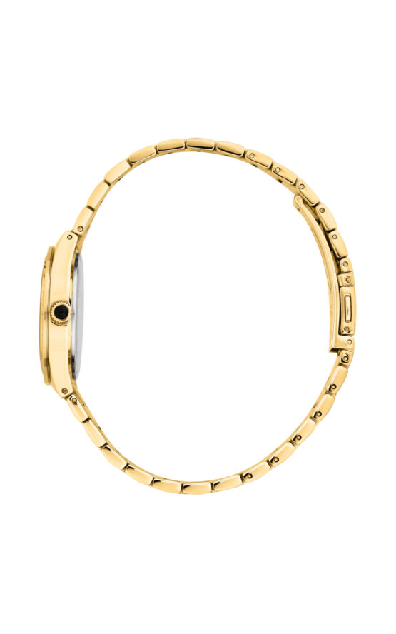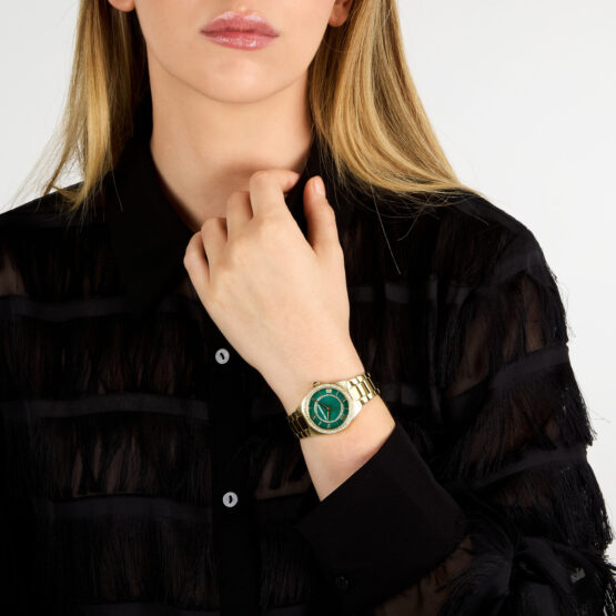 Γυναικείο ρολόι διαμέτρου 30mm με μηχανισμό Quartz ακριβείας. Έχει πράσινο καντράν με χρυσούς δείκτες και είναι διακοσμημένο με πέτρες. Η κάσα του είναι από ανοξείδωτο ατσάλι με κρύσταλλο από ορυκτό κρύσταλλο. Έχει μπρασελέ από ανοξείδωτο ατσάλι και κούμπωμα ασφαλείας. Είναι αδιάβροχο (5 ΑΤΜ).