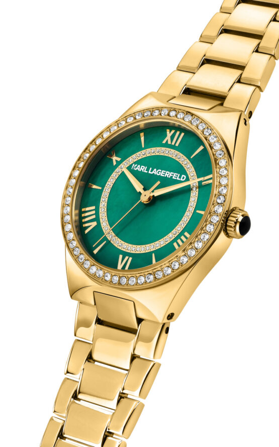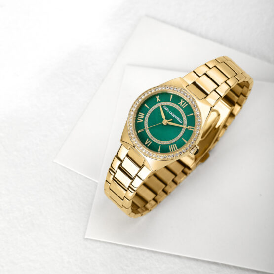 Γυναικείο ρολόι KARL LAGERFELD HAMBURG R0553105502 διαμέτρου 30mm, με μηχανισμό QUARTZ ακριβείας, πράσινο καντράν, κάσα και μπρασελέ από ανοξείδωτο ατσάλι και κούμπωμα ασφαλείας.