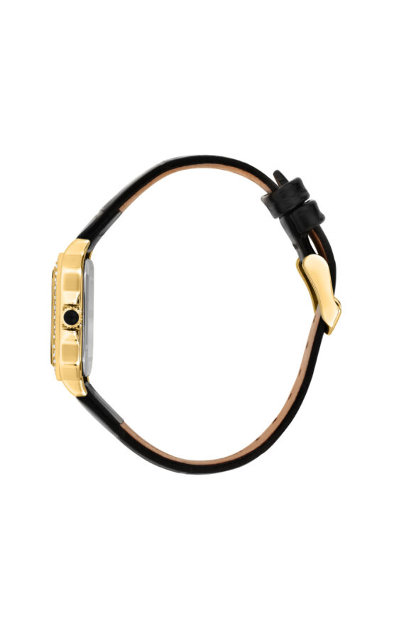 Γυναικείο ρολόι διαμέτρου 28X33mm με μηχανισμό Quartz ακριβείας. Έχει λευκό καντράν με χρυσούς δείκτες και λεπτομέρειες. Η κάσα του είναι από ανοξείδωτο ατσάλι με κρύσταλλο από ορυκτό κρύσταλλο. Έχει λουράκι από δέρμα και κούμπωμα τοκάς. Δεν είναι αδιάβροχο.