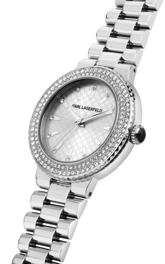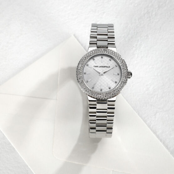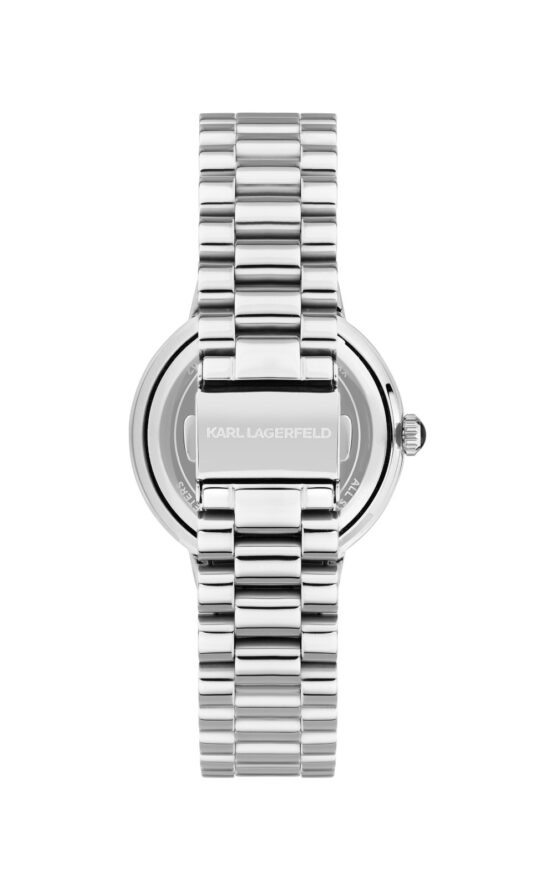 Γυναικείο ρολόι KARL LAGERFELD KAISER R0553104502 διαμέτρου 36mm, με μηχανισμό QUARTZ ακριβείας, ασημένιο καντράν, κάσα και μπρασελέ από ανοξείδωτο ατσάλι και κούμπωμα ασφαλείας.