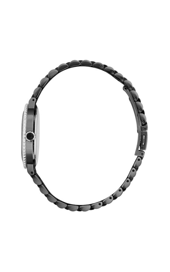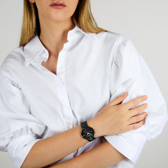 Γυναικείο ρολόι διαμέτρου 36mm με μηχανισμό Quartz ακριβείας. Έχει μαύρο καντράν με ασημένιους δείκτες και είναι διακοσμημένο με πέτρες. Η κάσα του είναι από ανοξείδωτο ατσάλι με κρύσταλλο από ορυκτό κρύσταλλο. Έχει μπρασελέ από ανοξείδωτο ατσάλι και κούμπωμα ασφαλείας. Είναι αδιάβροχο (5 ΑΤΜ).