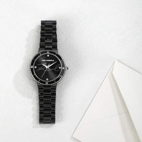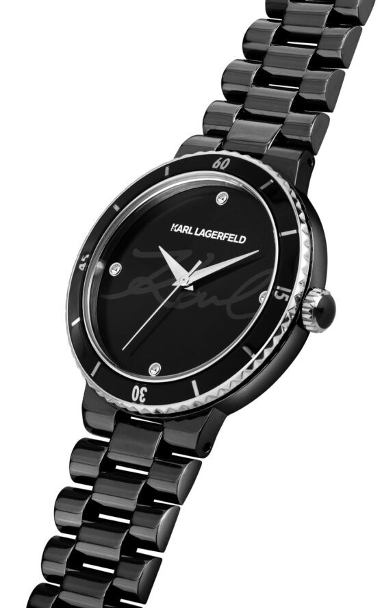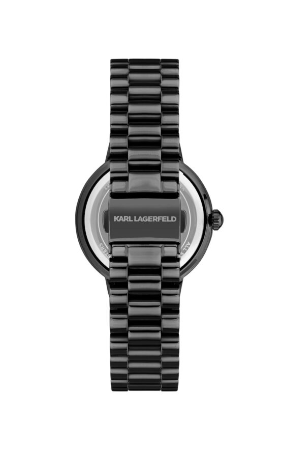 Γυναικείο ρολόι KARL LAGERFELD KAISER R0553104504 διαμέτρου 36mm, με μηχανισμό QUARTZ ακριβείας, μαύρο καντράν, κάσα και μπρασελέ από ανοξείδωτο ατσάλι και κούμπωμα ασφαλείας.
