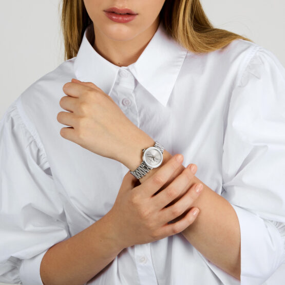 Γυναικείο ρολόι διαμέτρου 28mm με μηχανισμό Quartz ακριβείας. Έχει λευκό καντράν με ασημένιους δείκτες και λεπτομέρειες. Η κάσα του είναι από ανοξείδωτο ατσάλι με κρύσταλλο από ορυκτό κρύσταλλο. Έχει μπρασελέ από ανοξείδωτο ατσάλι και κούμπωμα ασφαλείας. Είναι αδιάβροχο (5 ΑΤΜ).