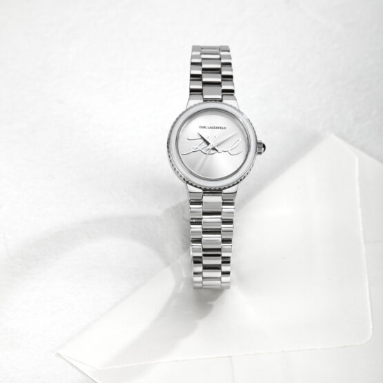 Γυναικείο ρολόι KARL LAGERFELD KAISER R0553104509 διαμέτρου 28mm, με μηχανισμό QUARTZ ακριβείας, λευκό καντράν, κάσα και μπρασελέ από ανοξείδωτο ατσάλι και κούμπωμα ασφαλείας.
