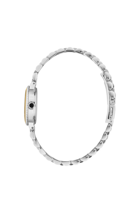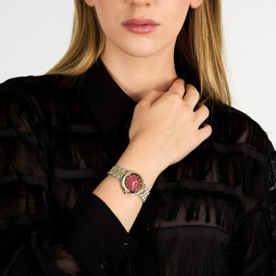 Γυναικείο ρολόι διαμέτρου 28mm με μηχανισμό Quartz ακριβείας. Έχει κόκκινο καντράν με χρυσούς δείκτες και είναι διακοσμημένο με πέτρες. Η κάσα του είναι από ανοξείδωτο ατσάλι με κρύσταλλο από ορυκτό κρύσταλλο. Έχει μπρασελέ από ανοξείδωτο ατσάλι και κούμπωμα ασφαλείας. Είναι αδιάβροχο (5 ΑΤΜ).