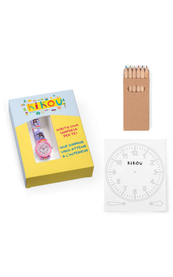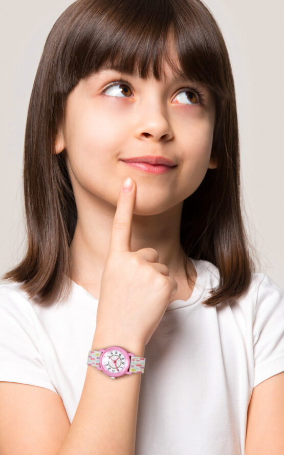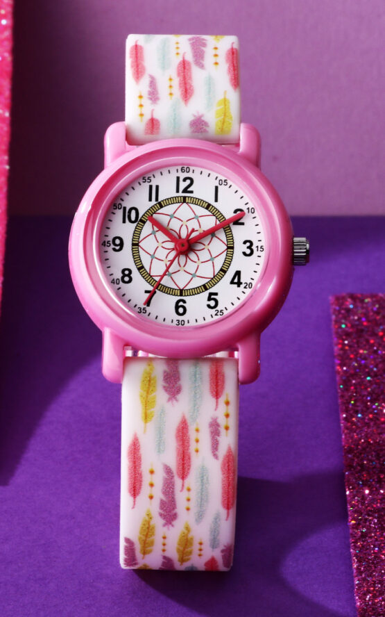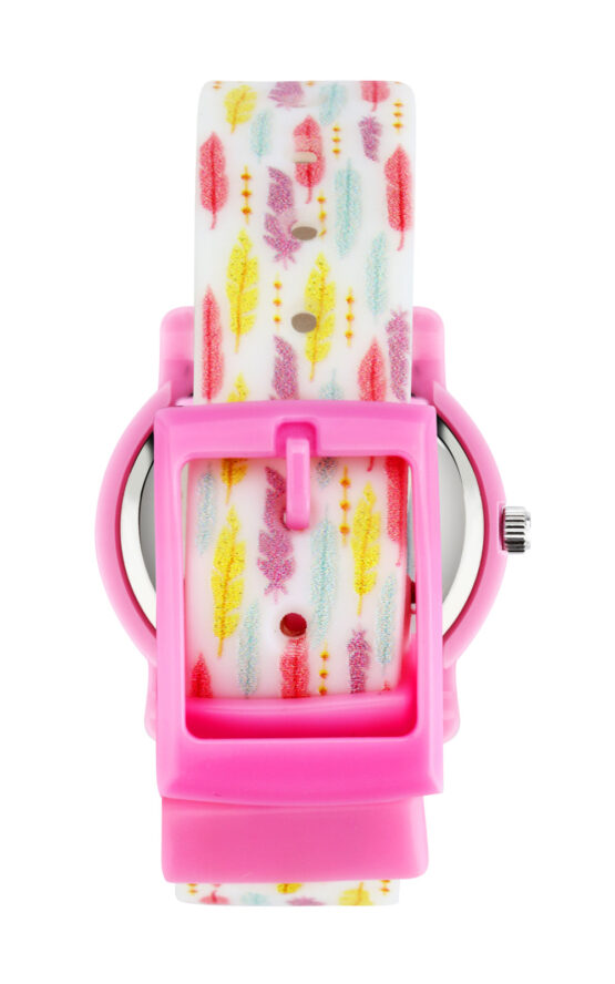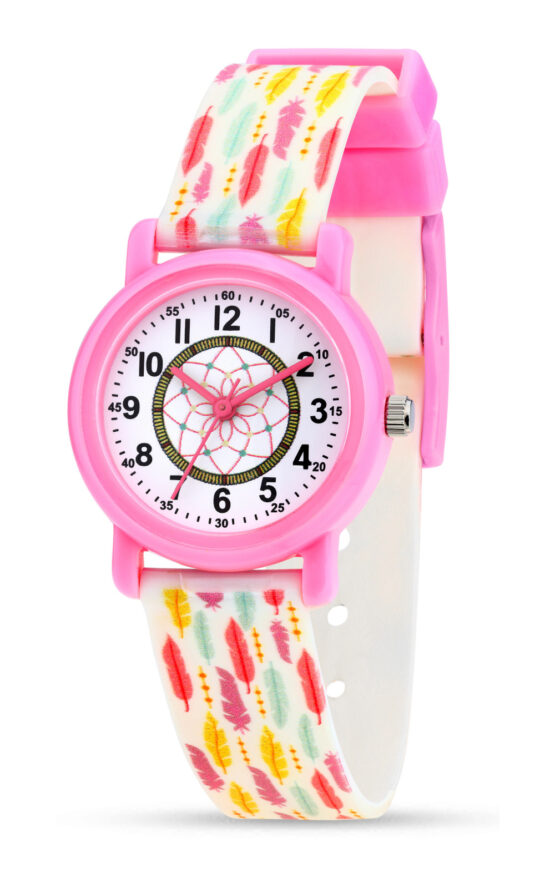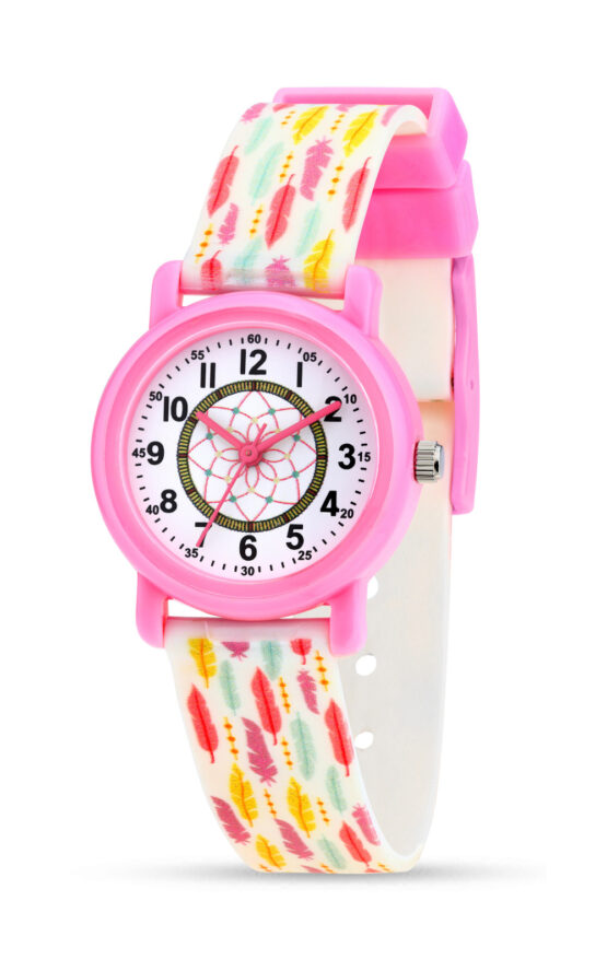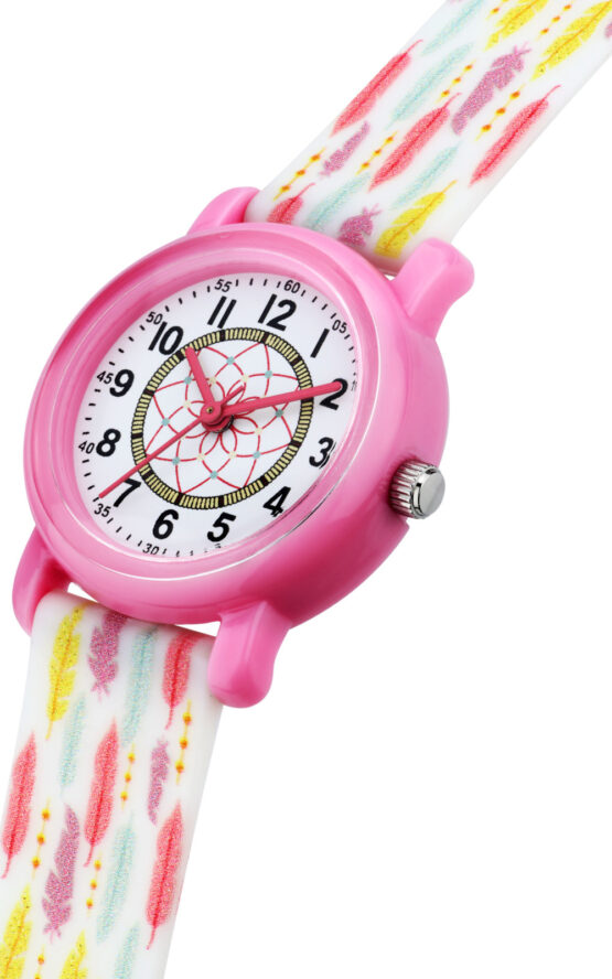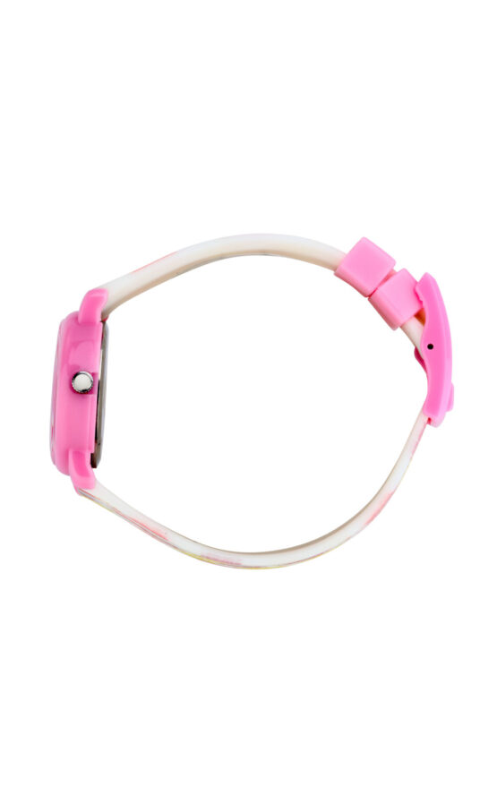 Παιδικό ρολόι διαμέτρου 28mm με μηχανισμό QUARTZ ακριβείας. Έχει λευκό καντράν με ροζ δείκτες. Η κάσα του είναι ροζ πλαστική με κρύσταλλο από πλαστικό φακό. Έχει λευκό πλαστικό λουράκι με κόκκινες, κίτρινες, ροζ και γαλάζιες λεπτομέριες και κούμπωμα τοκάς. Δεν είναι αδιάβροχο.