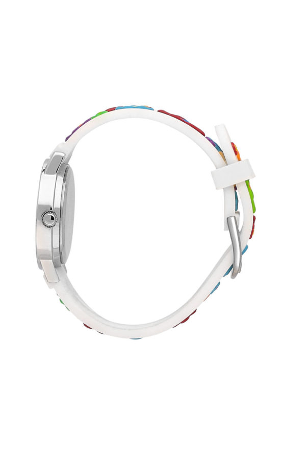 Παιδικό ρολόι διαμέτρου 28mm με μηχανισμό QUARTZ ακριβείας. Έχει λευκό καντράν με ροζ δείκτες και μαύρες λεπτομέρειες. Η κάσα του είναι μεταλλική με κρύσταλλο από ορυκτό κρύσταλλο ειδικής σκλήρυνσης. Έχει λευκό καουτσούκ λουράκι με λουλούδια και κούμπωμα τοκάς. Δεν είναι αδιάβροχο.