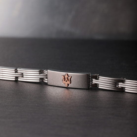 Ανδρικό βραχιόλι MASERATI από ανοξείδωτο ατσάλι. To βραχιόλι είναι ασημένιου χρώματος με ροζ χρυσές λεπτομέρειες και έχει το λογότυπο της εταιρείας(21,5cm).
