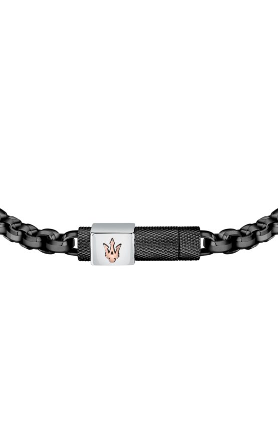 Ανδρικό βραχιόλι MASERATI από ανοξείδωτο ατσάλι. To βραχιόλι έχει μαύρο χρώμα και ροζ χρυσό λογότυπο της εταιρείας(21,5cm).